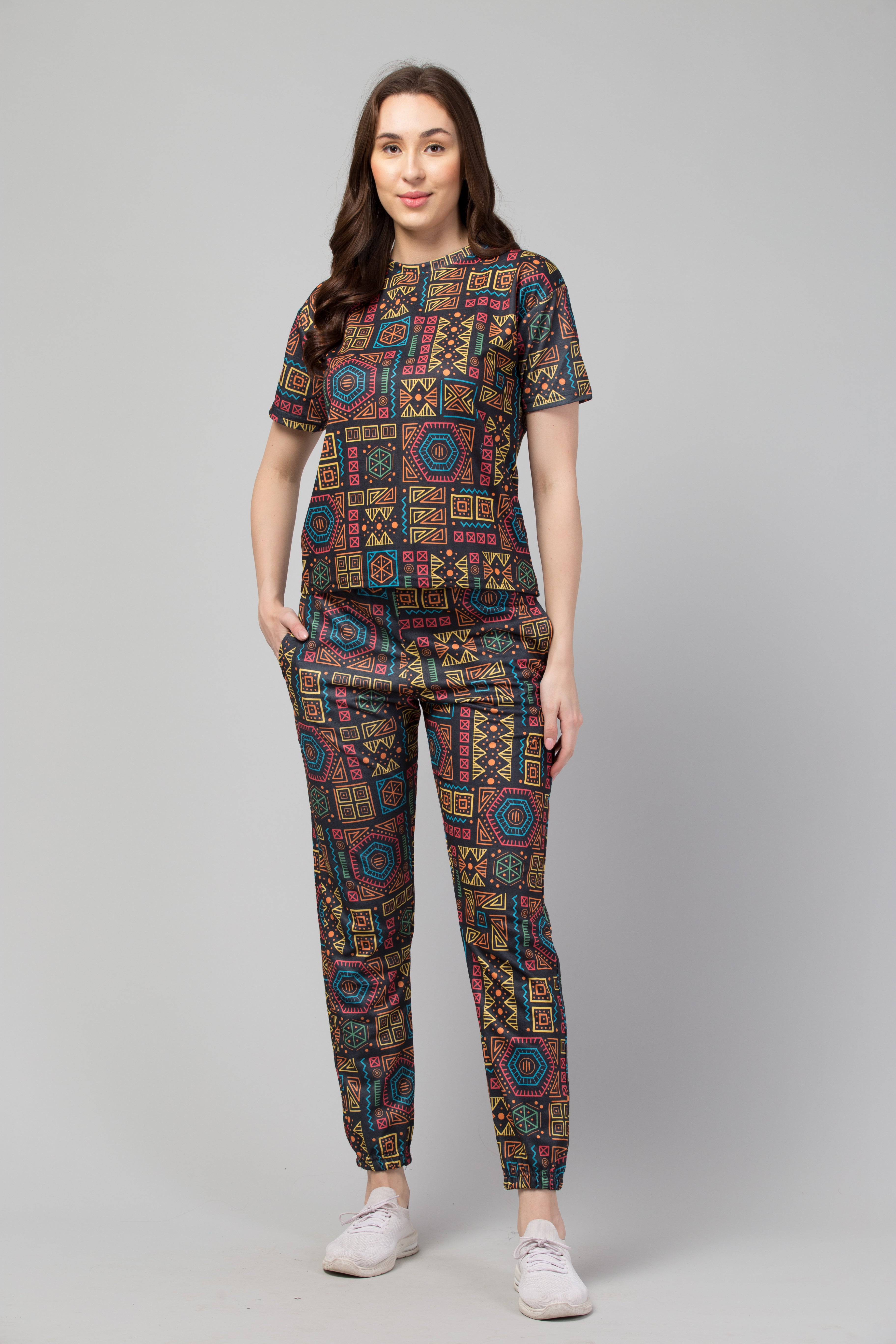 Discover the allure of tribal art with our "Abstract Aztec Coord Set". This t-shirt and jogger combo features a unique blend of tribal abstraction and cubist inspiration, resulting in a standout print that's sure to draw eyes. Traditional Indian motifs and detailed line-work add an intriguing layer of depth to the design, while crossed colors and colorful mosaics create a vibrant, playful aesthetic. The texture is richly detailed, giving the ensemble a distinctive, tactile appeal. Ideal for those who appreciate the unconventional, the Abstract Aztec Coord Set brings artistry and comfort together in one stylish package.