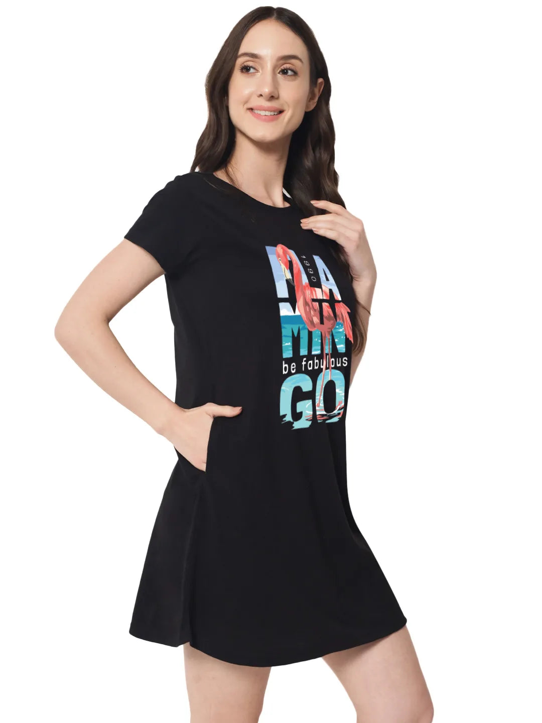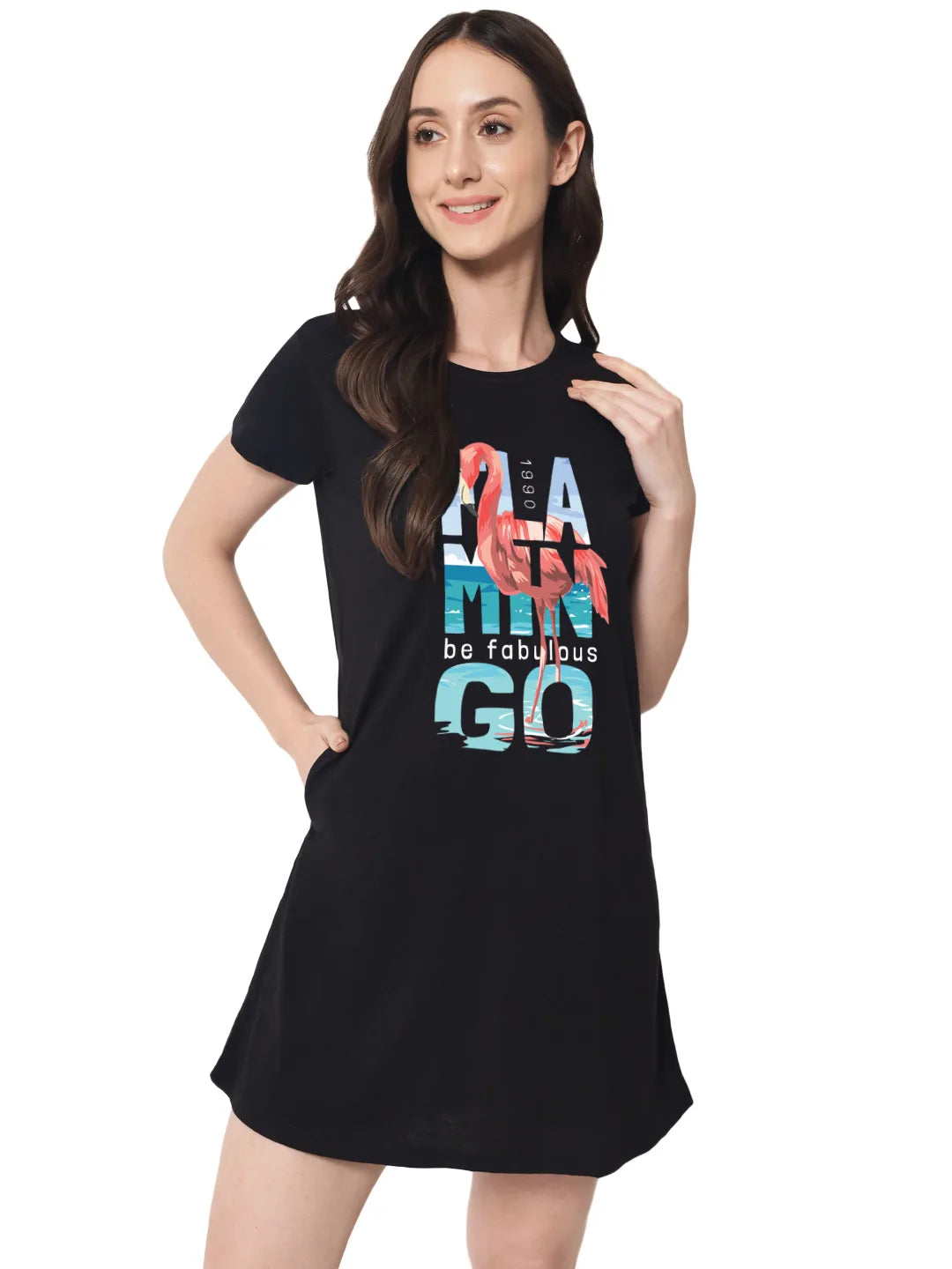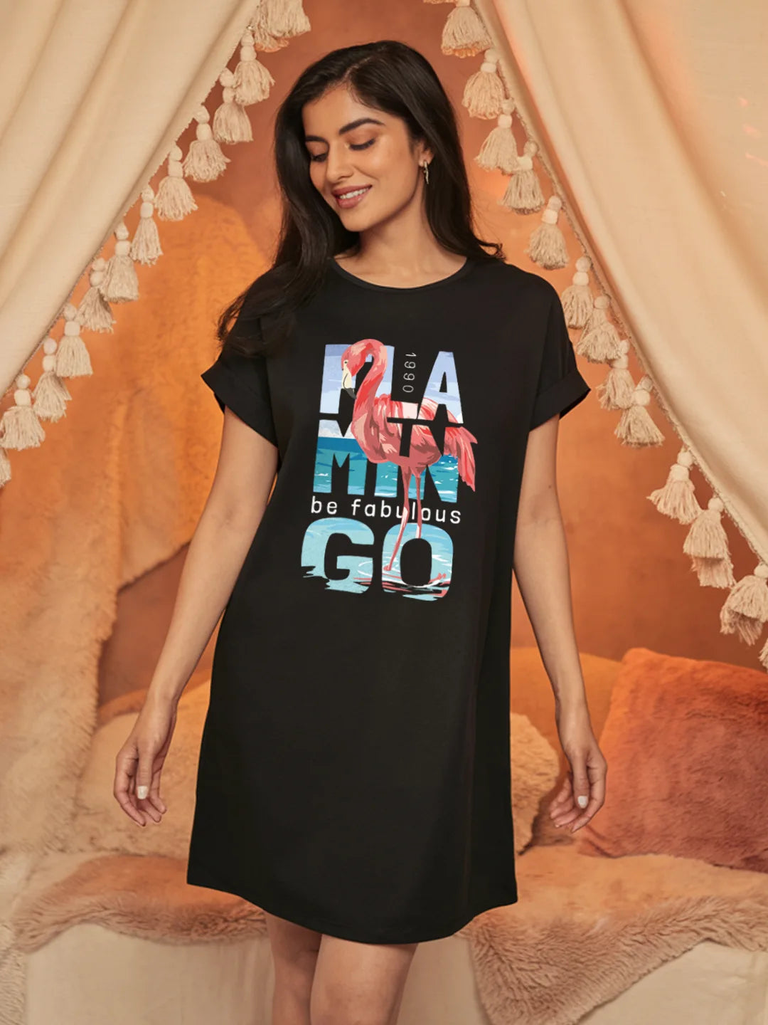 Get ready for summer with our 'Be Fabulous Tee Dress' With a vibrant and colorful flamingo print and the phrase 'Flamingo and be fabulous,' this top is perfect for lounging or running errands. Made with soft and stretchy material, this top is both comfortable and stylish