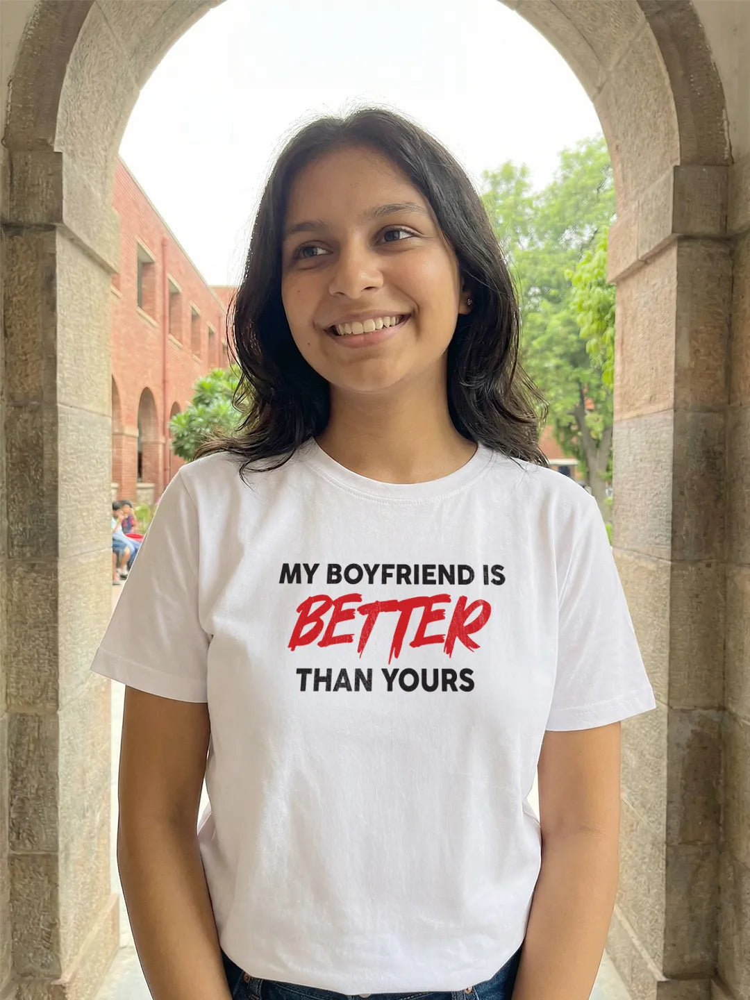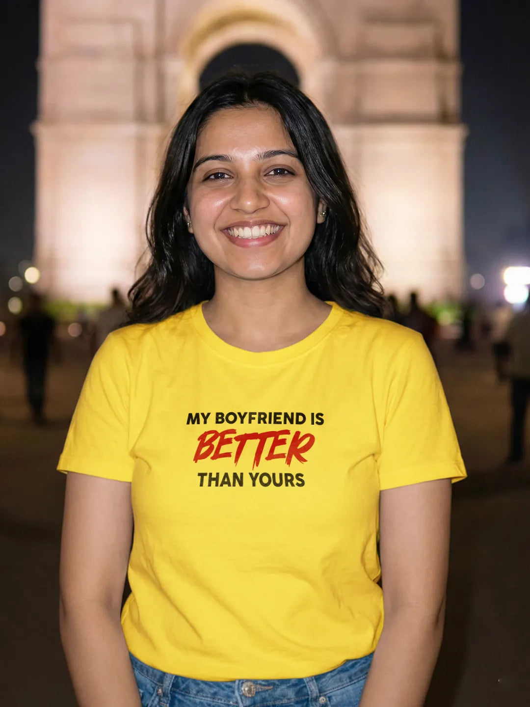 Set on a crisp white & Yellow base, the vibrant red typography steals the spotlight, symbolising passion, love, and just the right amount of sass. The high-contrast colour combination keeps the look fresh, striking, and effortlessly eye-catching—perfect for Valentine’s dates, travel days, couple photos, or casual outings with attitude.