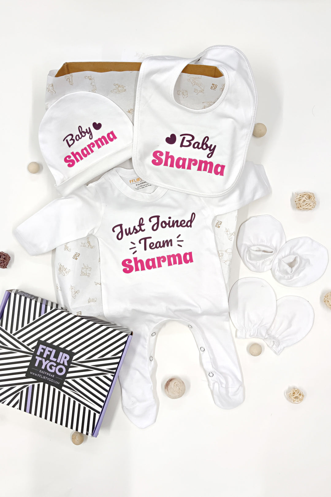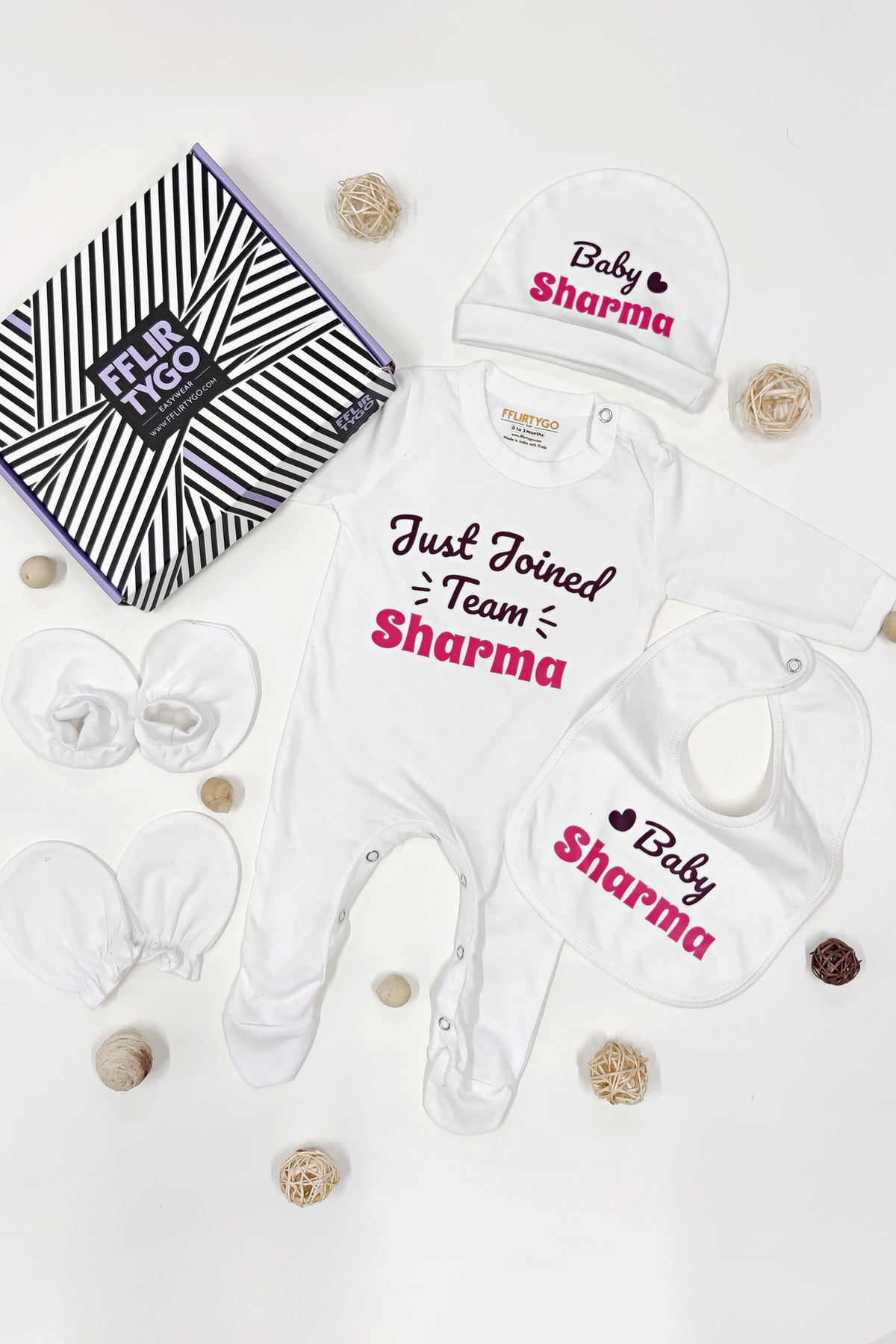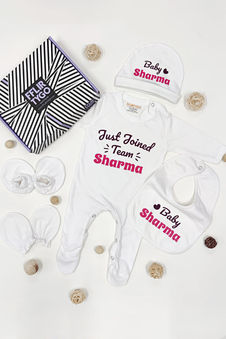 This delightful gift set includes a plush baby jumpsuit for cuddly comfort, a protective cap, a pair of gentle mittens, cozy booties, and a handy bib. The items are adorned with an adorable pink print that proclaims "Joined Team [Surname]" and "Baby [Surname]", creating a charming and personalized touch to this lovely gift.