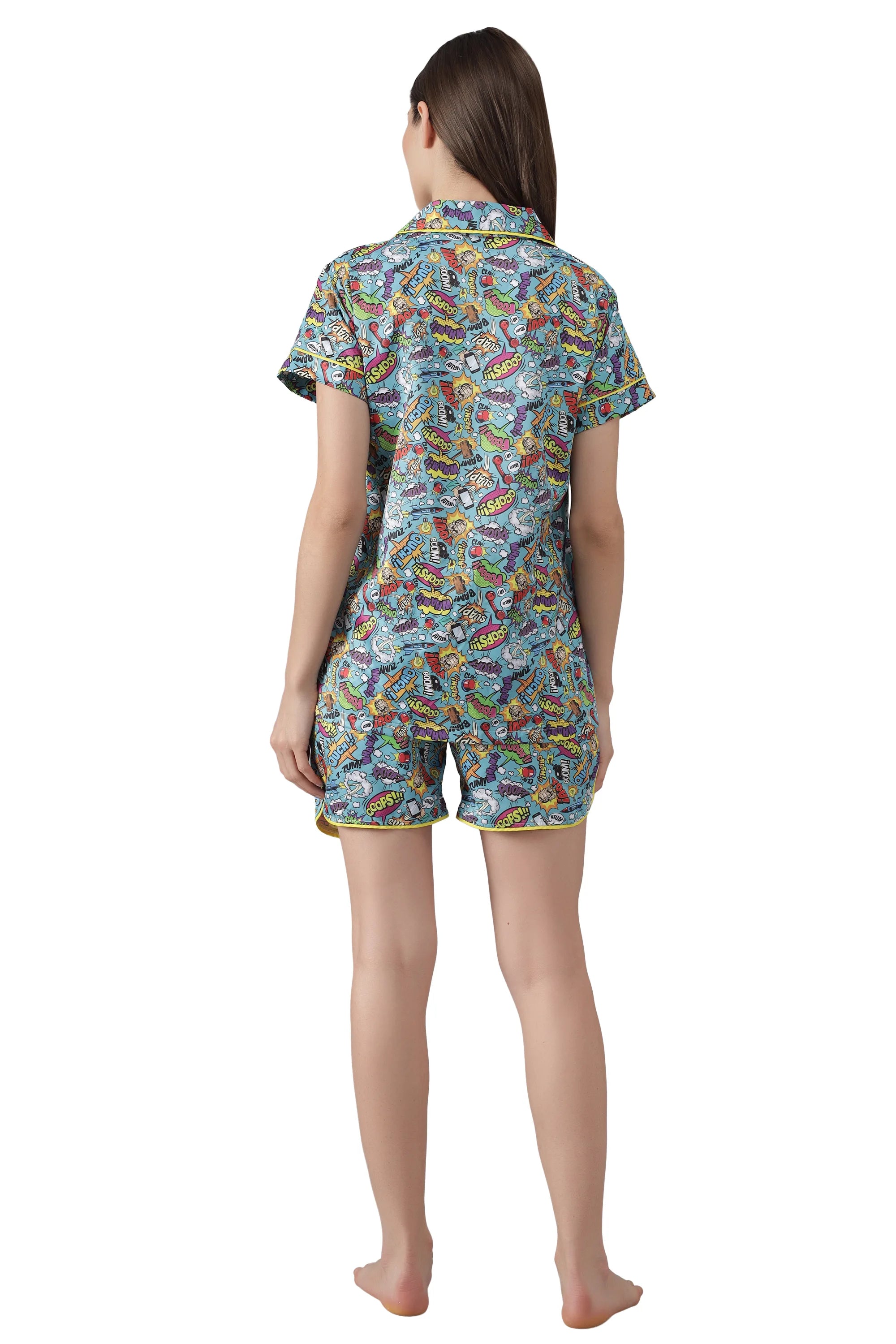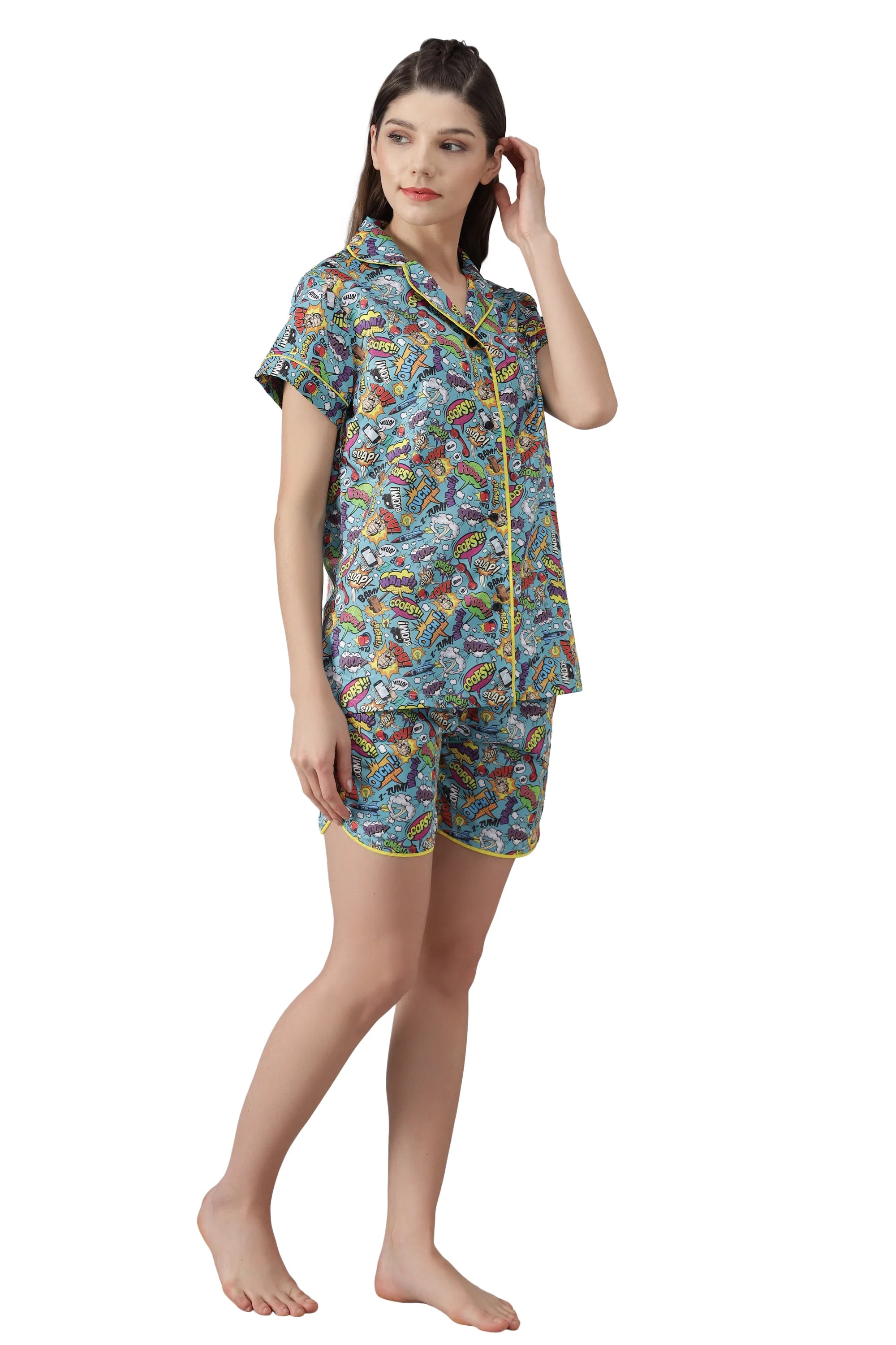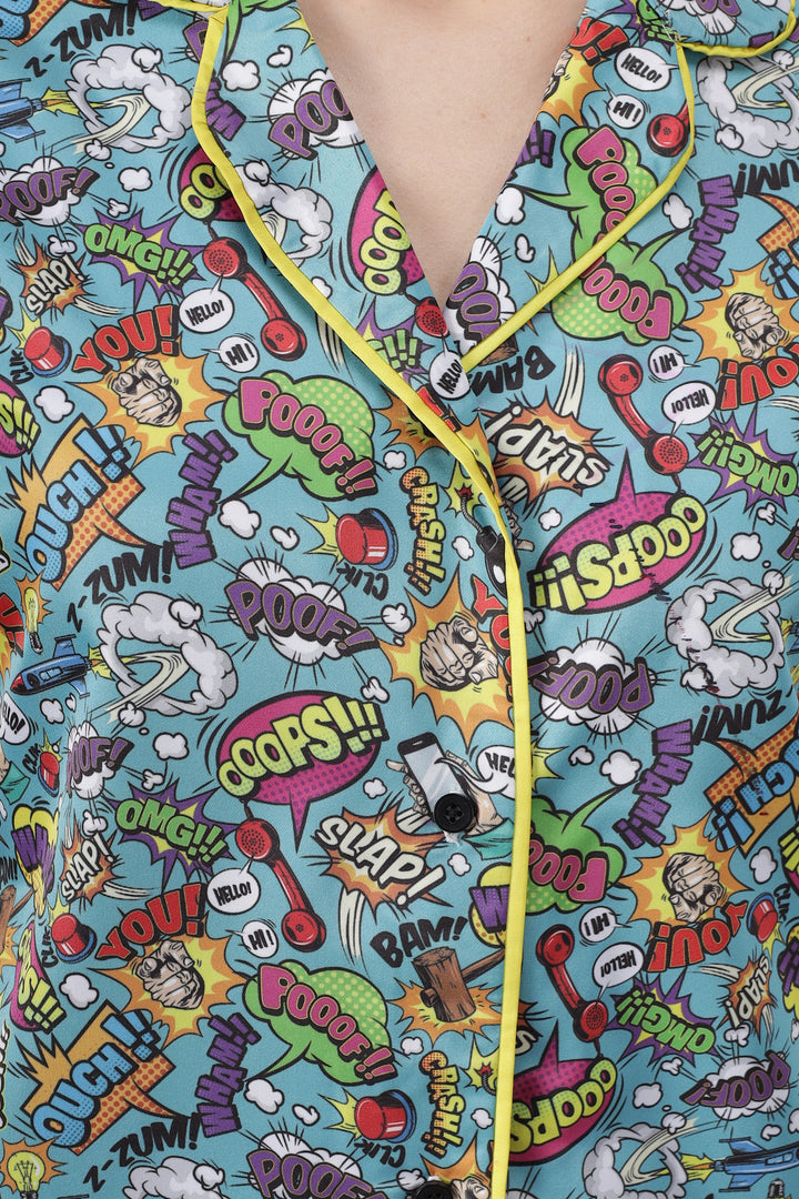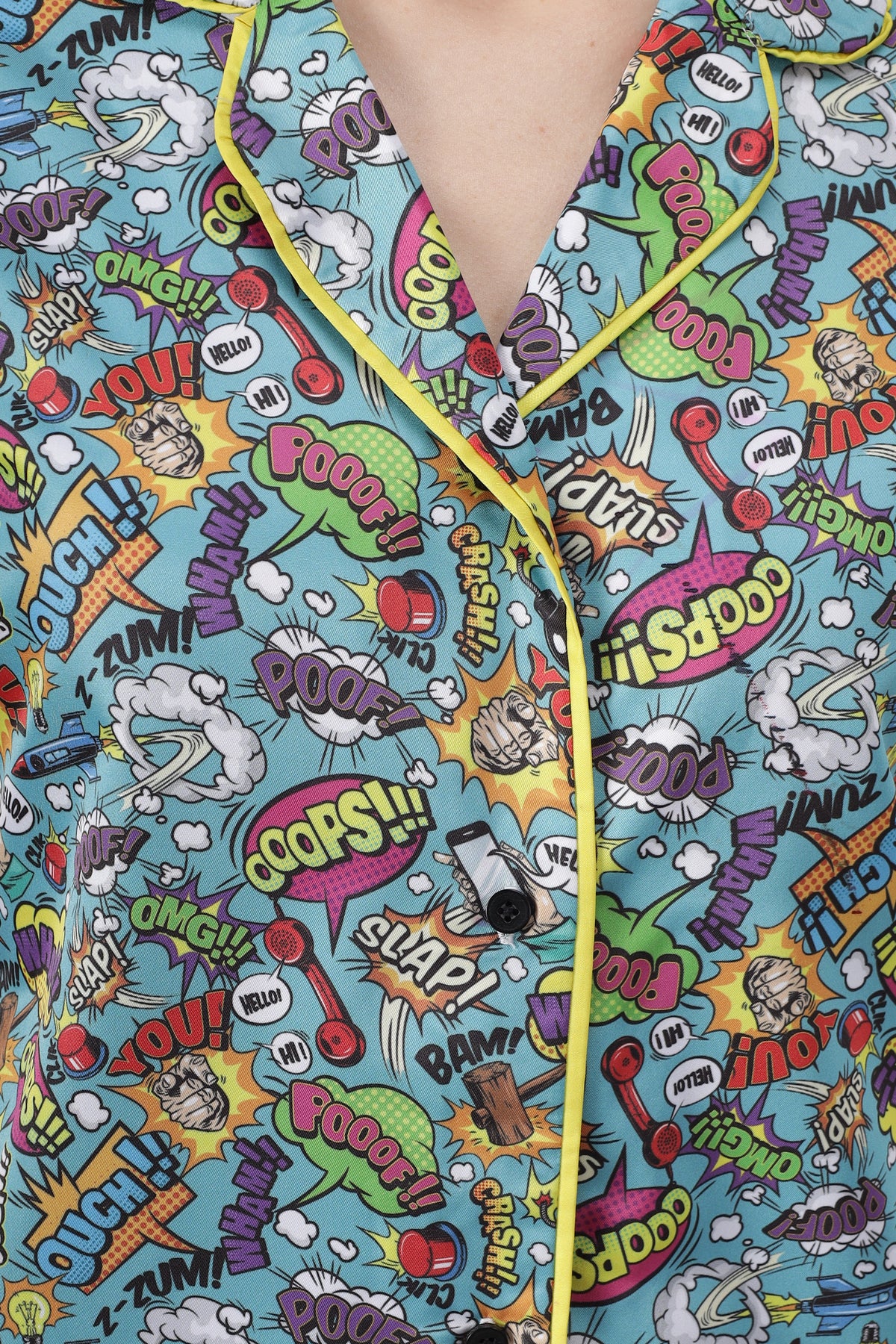 Add some fun and flair to your sleepwear collection with our Comic Book Inspired Shirt and Short Set! This stylish set features a fabric with a subtle sheen that adds a touch of glamour. The print is inspired by comic books, giving it a unique and playful look. The shirt has a relaxed fit and short sleeves, while the shorts have a comfortable elastic waistband and a relaxed fit. Whether you're lounging at home or spending a relaxing evening in, this set is sure to become a staple in your wardrobe. Made from soft and lightweight fabric, it's comfortable to wear all night long. So why wait?