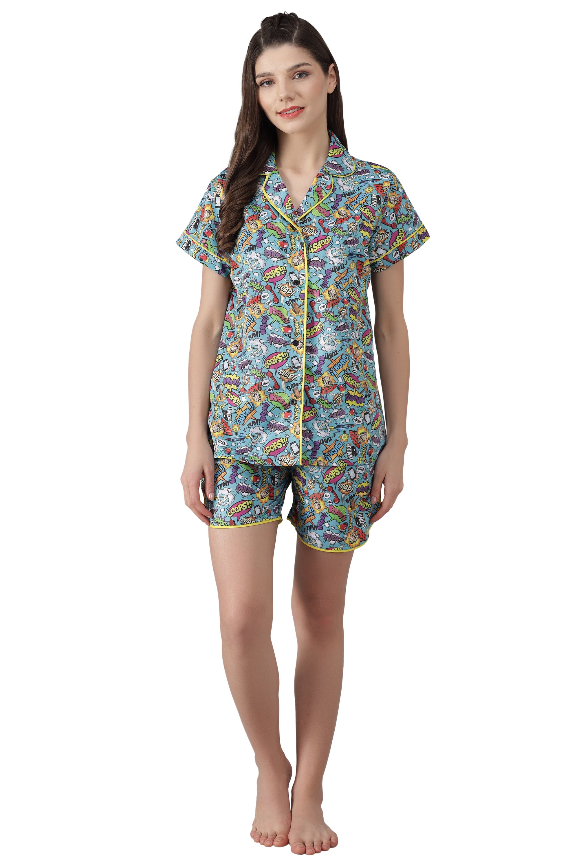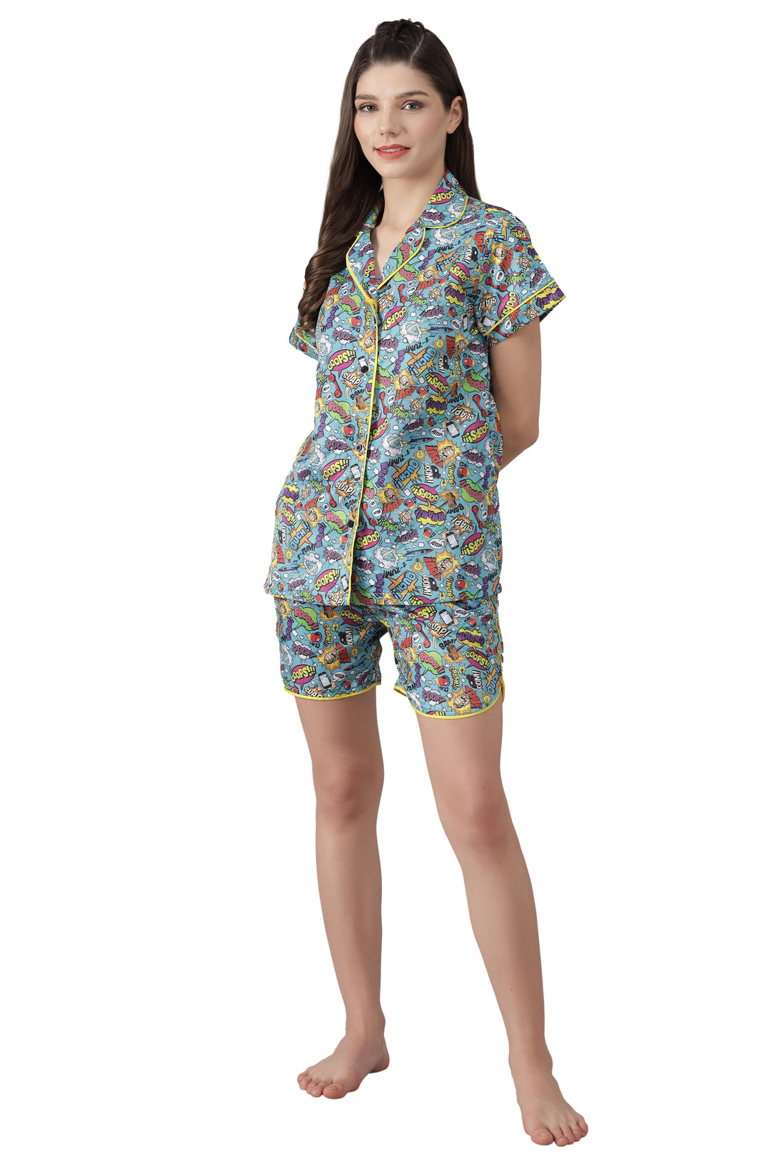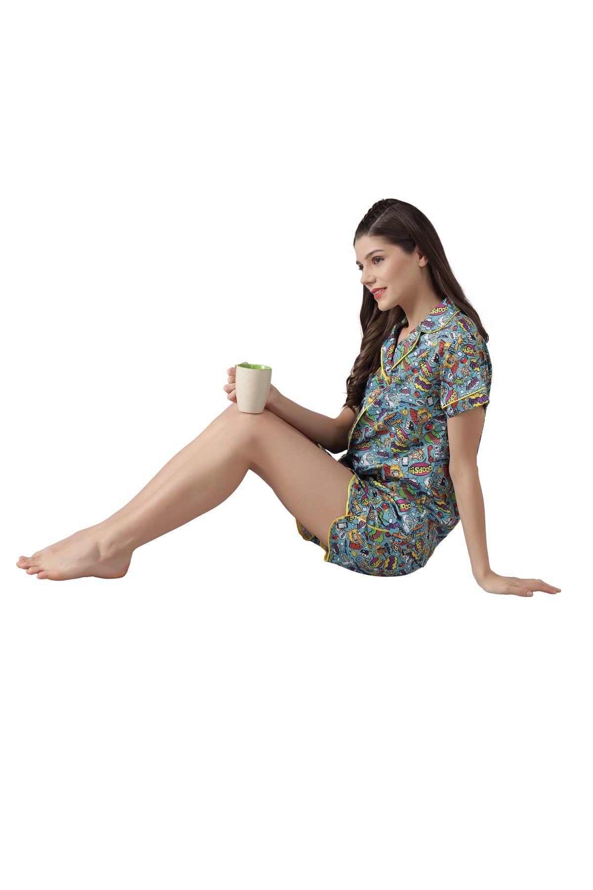 Add some fun and flair to your sleepwear collection with our Comic Book Inspired Shirt and Short Set! This stylish set features a fabric with a subtle sheen that adds a touch of glamour. The print is inspired by comic books, giving it a unique and playful look. The shirt has a relaxed fit and short sleeves, while the shorts have a comfortable elastic waistband and a relaxed fit. Whether you're lounging at home or spending a relaxing evening in, this set is sure to become a staple in your wardrobe. Made from soft and lightweight fabric, it's comfortable to wear all night long. So why wait?