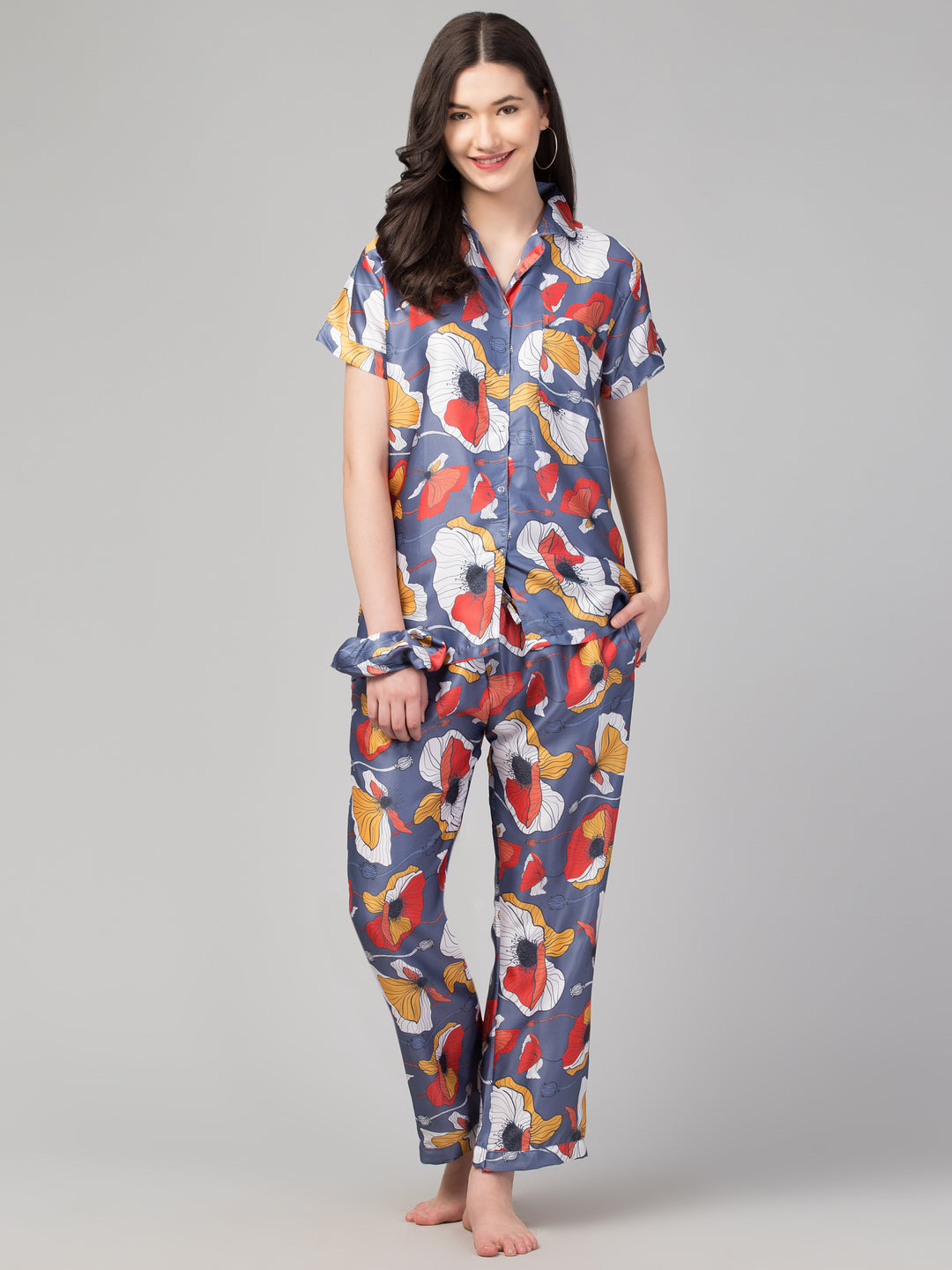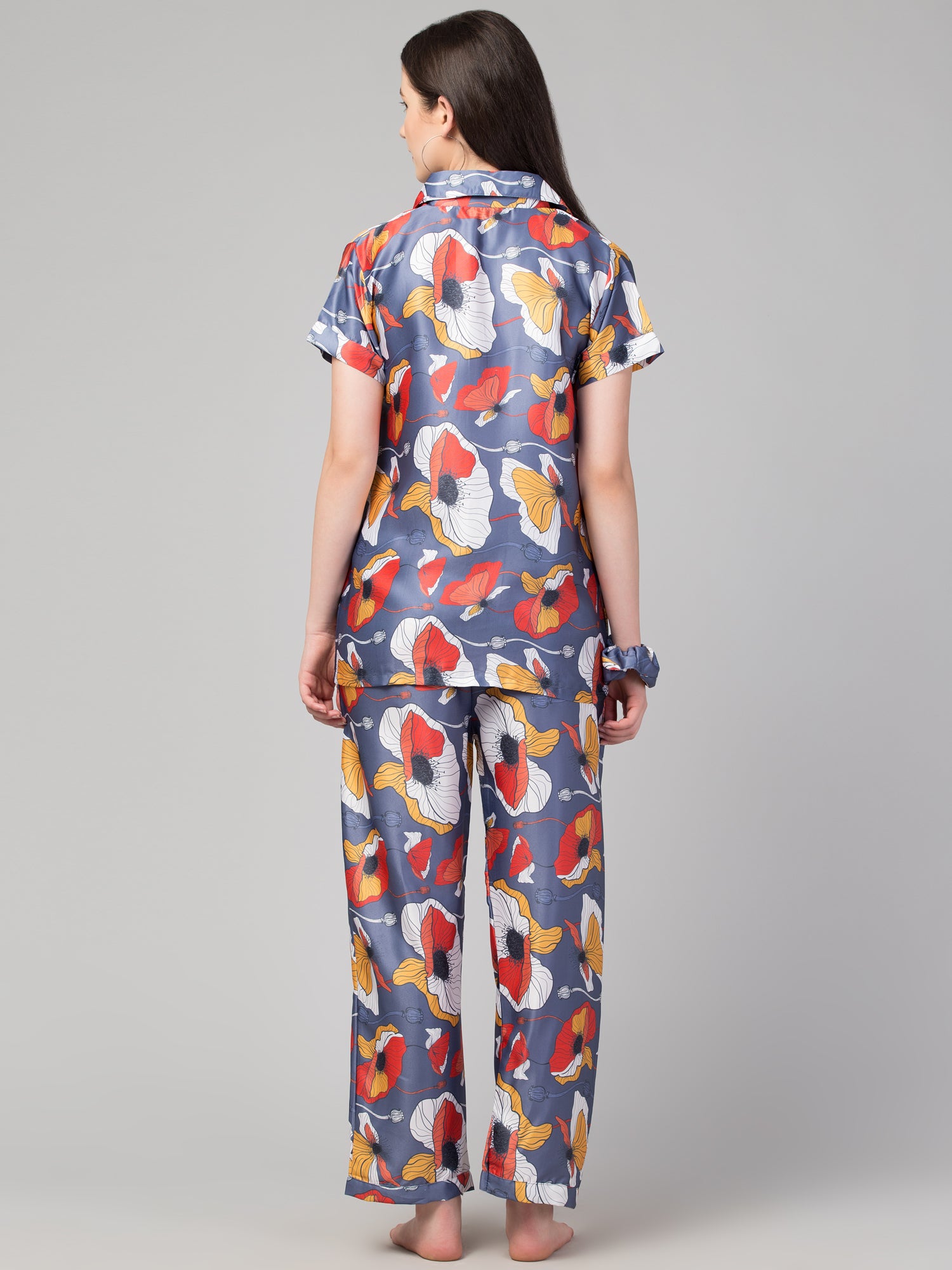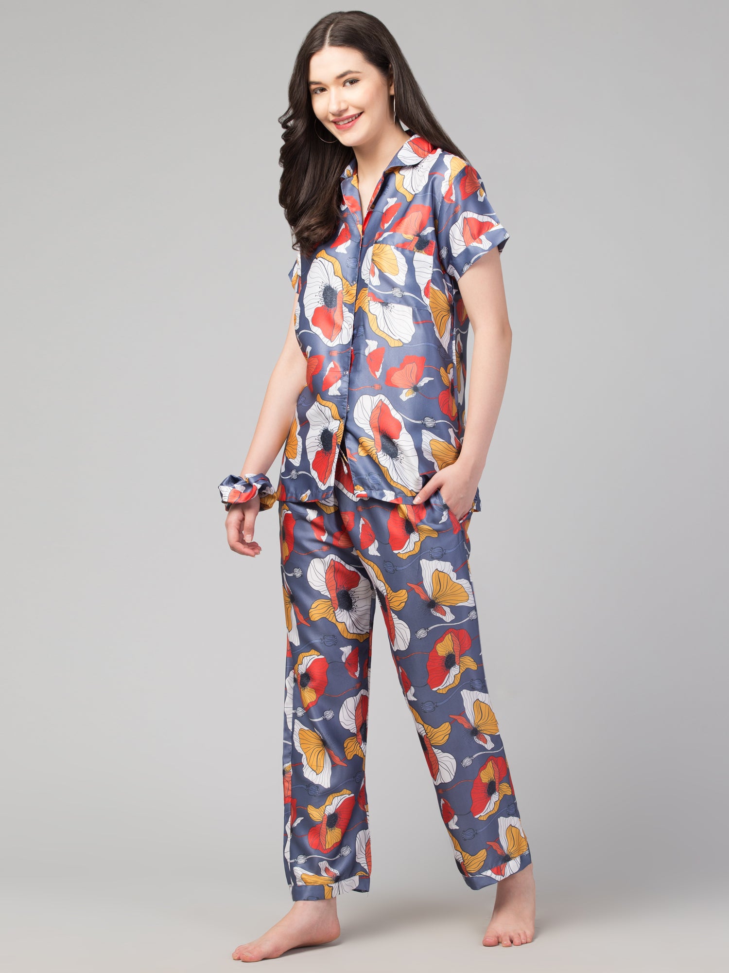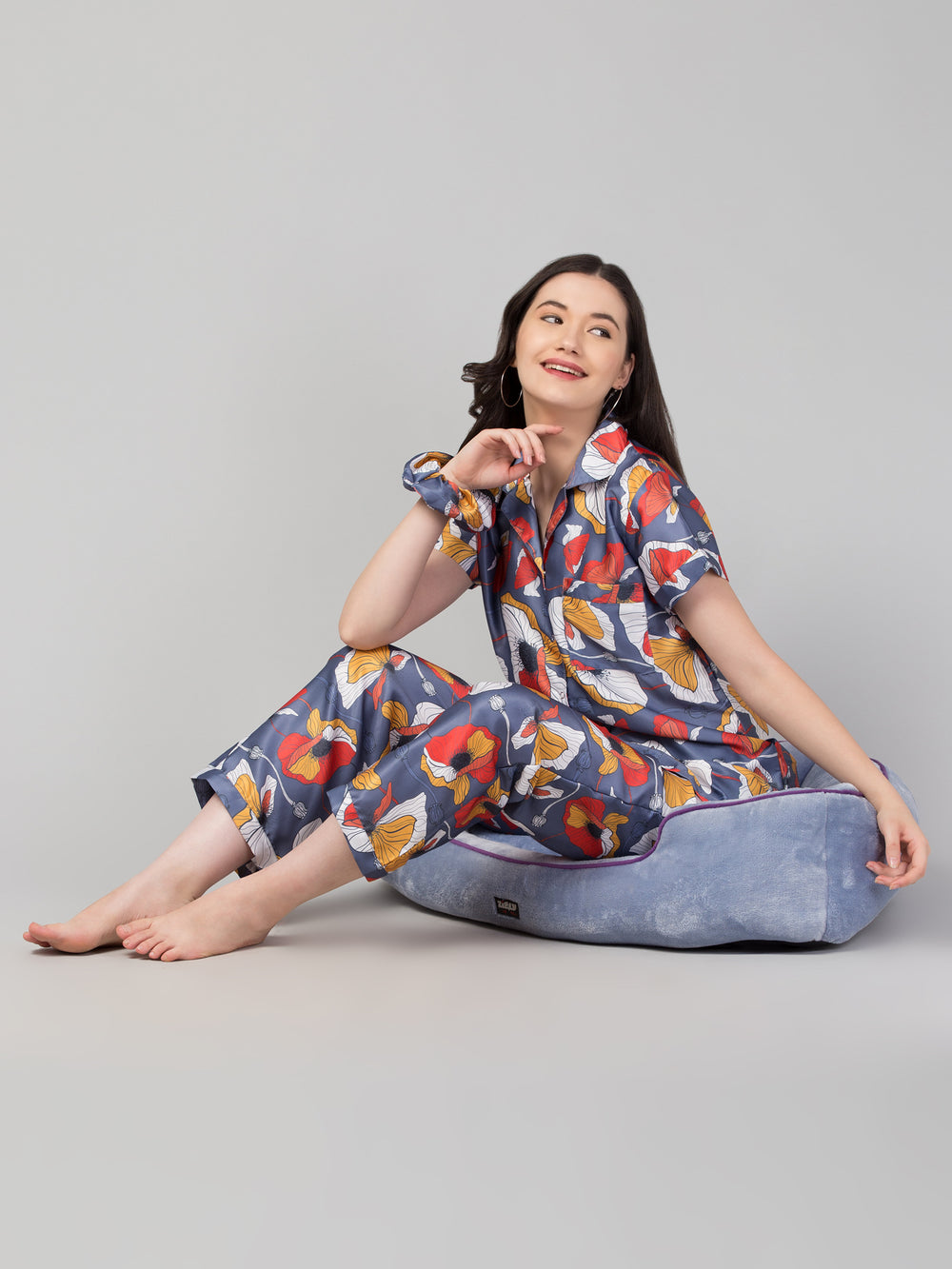 Elevate your sleepwear collection with our "Dawning Petals Satin Pajama Set". Made from premium polyester satin, this set offers unrivalled comfort and a luxurious feel. The design showcases an enchanting print of large flowers in shades of white, yellow, and red, seemingly spreading horizontally across a sleek grey base. The shirt, equipped with practical snap buttons, and the matching pajamas come together to create an undeniably stylish ensemble. To add an extra touch of charm, each set is complemented with a matching scrunchie. Sleep beautifully and wake up rejuvenated with our Dawning Petals Satin Pajama Set!