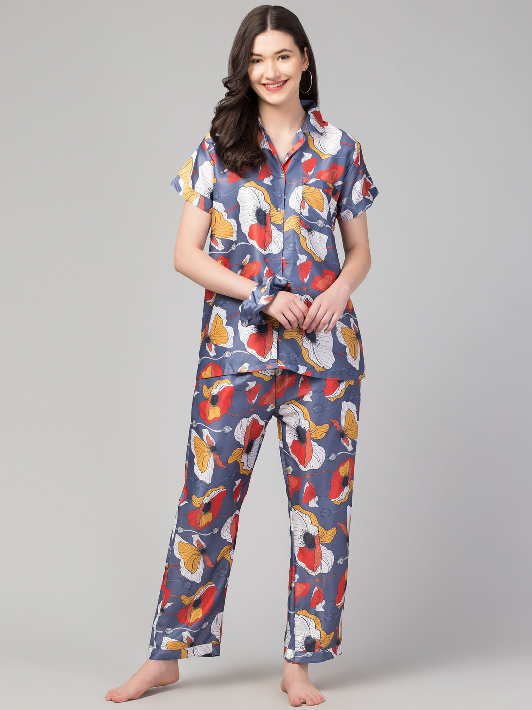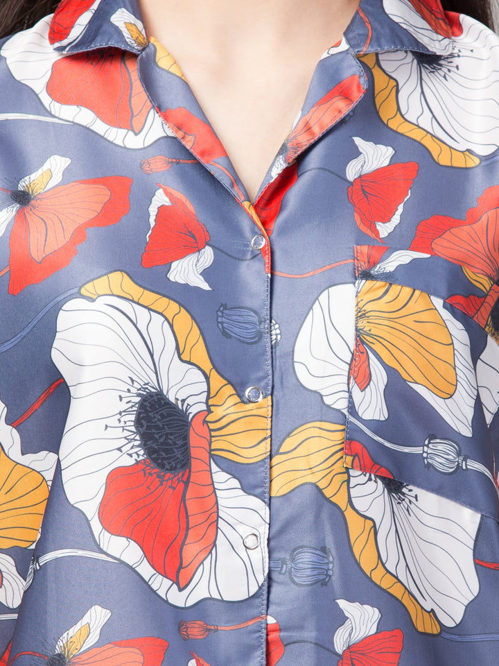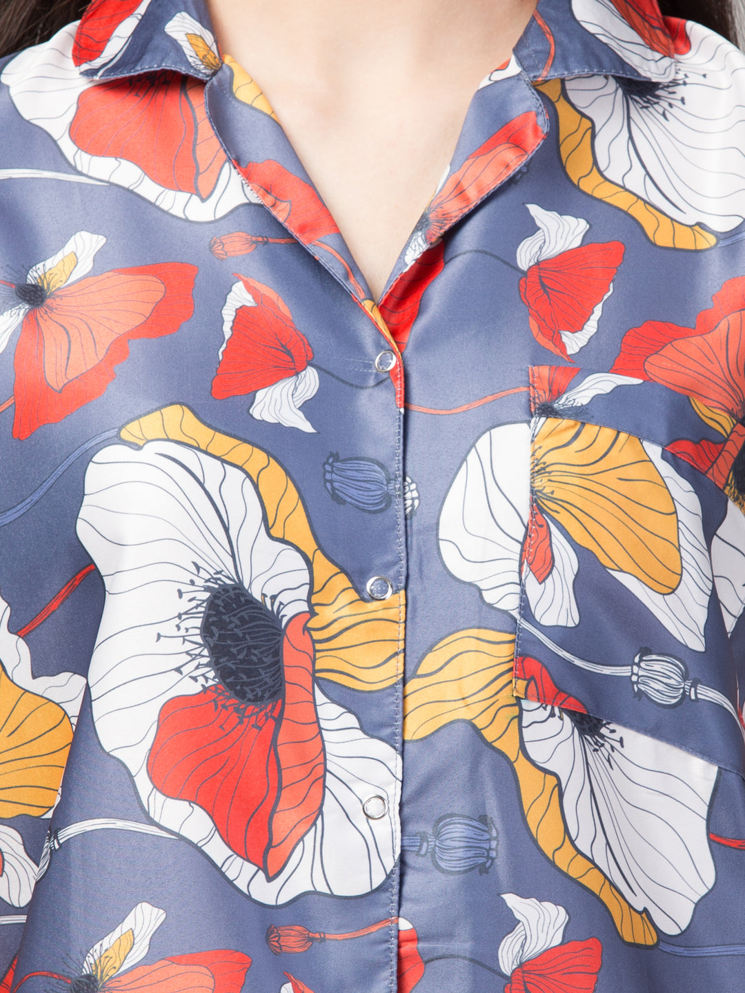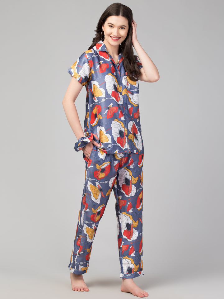 Elevate your sleepwear collection with our "Dawning Petals Satin Pajama Set". Made from premium polyester satin, this set offers unrivalled comfort and a luxurious feel. The design showcases an enchanting print of large flowers in shades of white, yellow, and red, seemingly spreading horizontally across a sleek grey base. The shirt, equipped with practical snap buttons, and the matching pajamas come together to create an undeniably stylish ensemble. To add an extra touch of charm, each set is complemented with a matching scrunchie. Sleep beautifully and wake up rejuvenated with our Dawning Petals Satin Pajama Set!