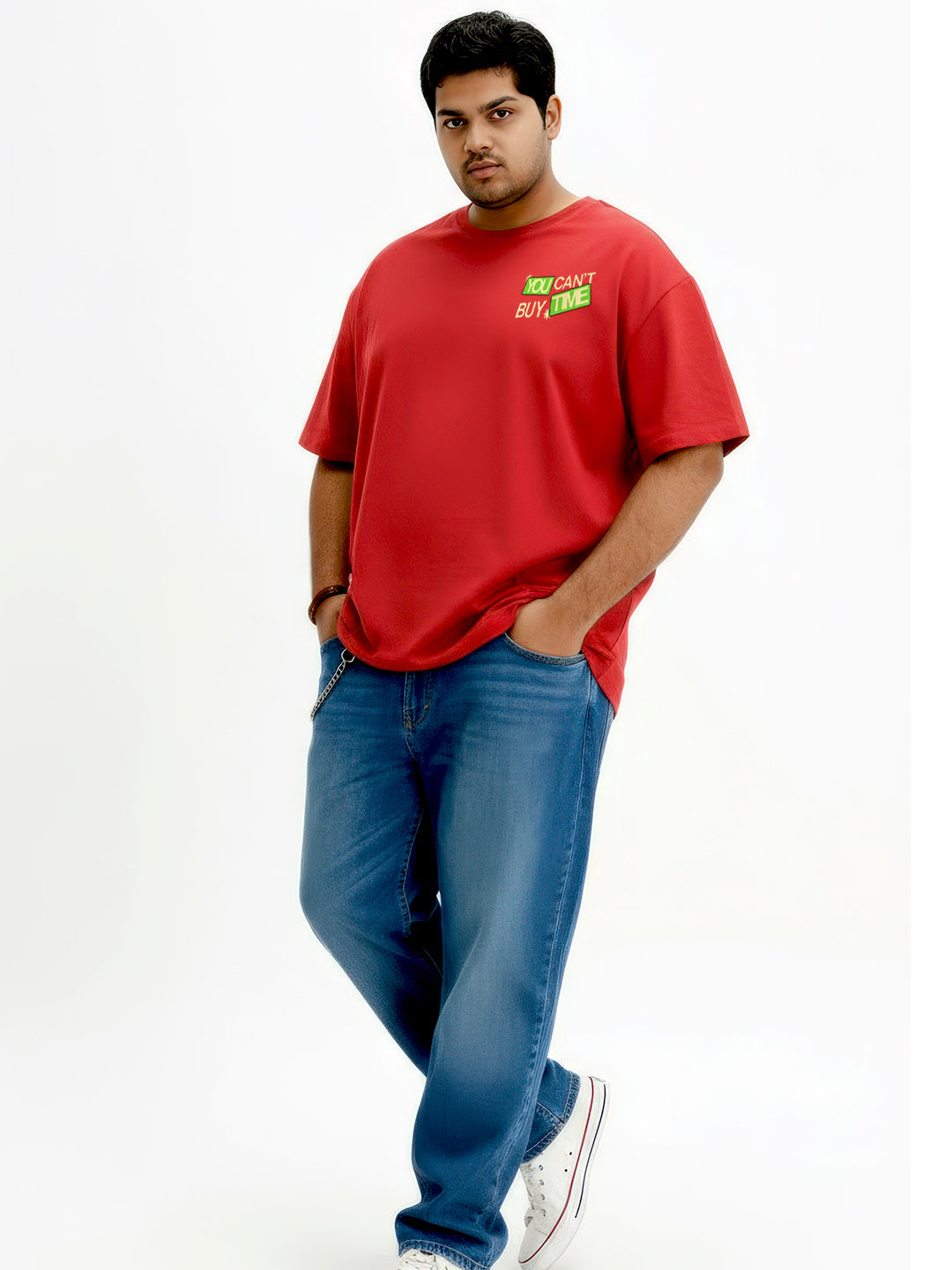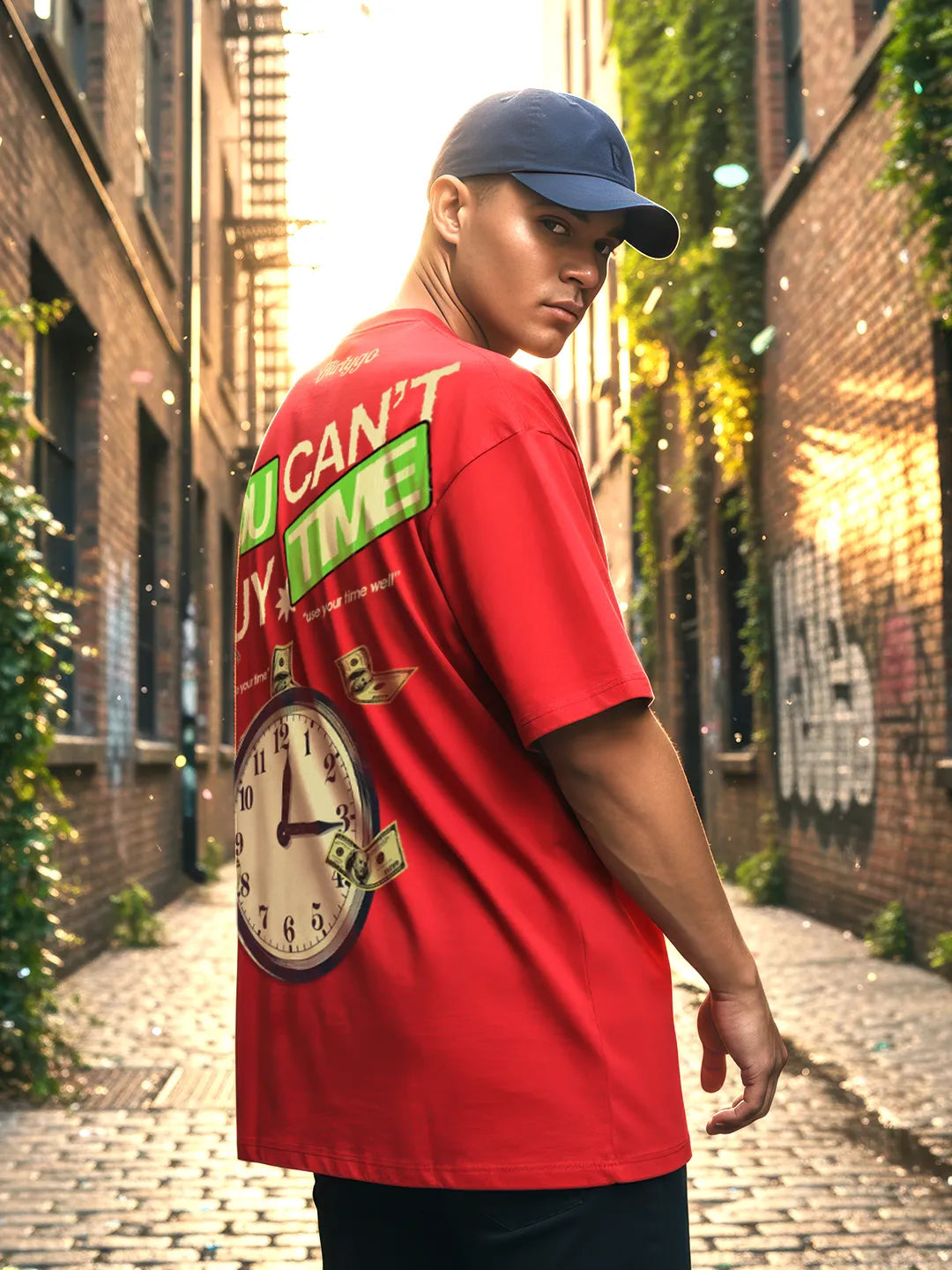 The standout print typography in electric green contrasts the fiery red base, creating a visual pop that feels bold yet elevated. The back graphic — a vintage clock surrounded by floating bills — drives home the message: money comes and goes, time doesn’t.