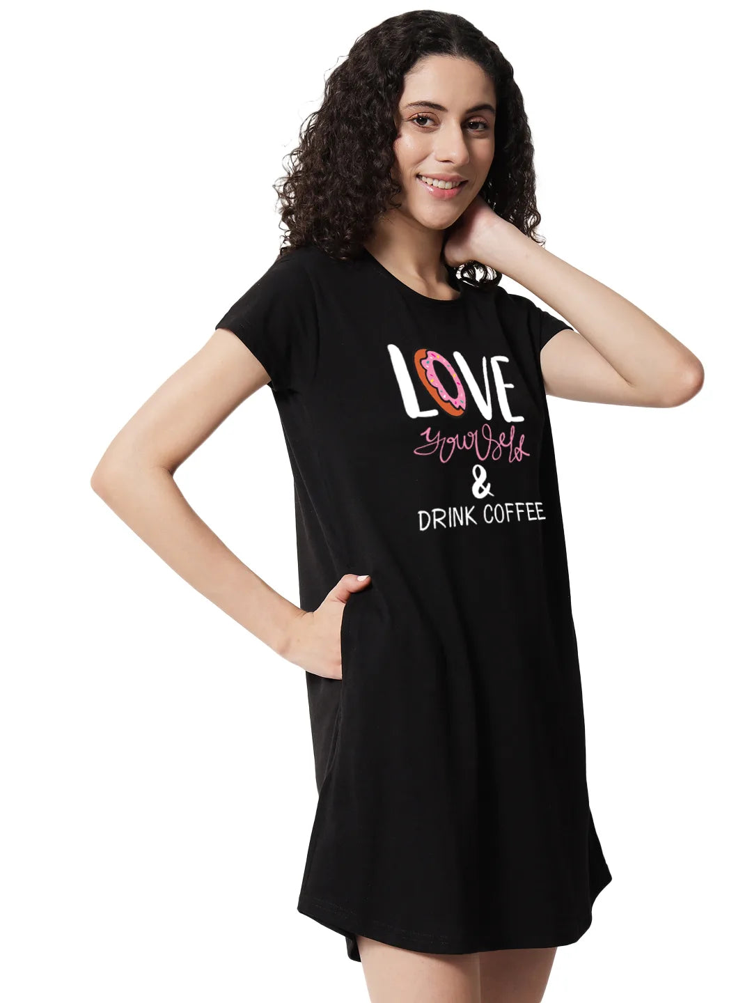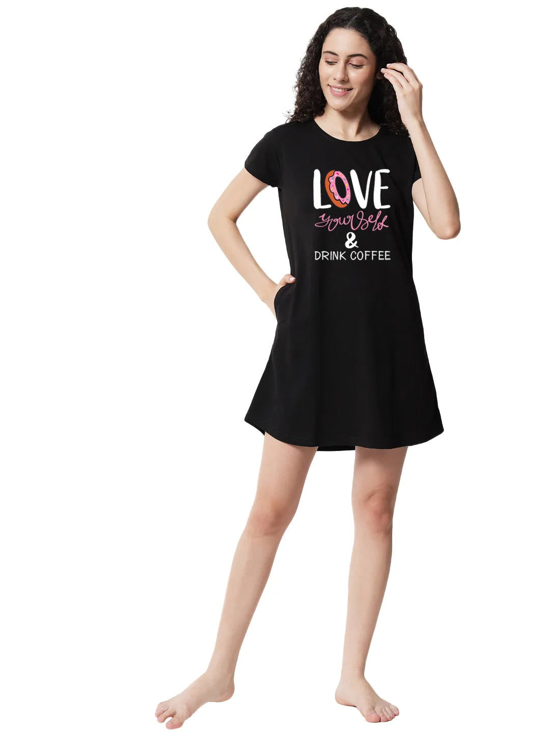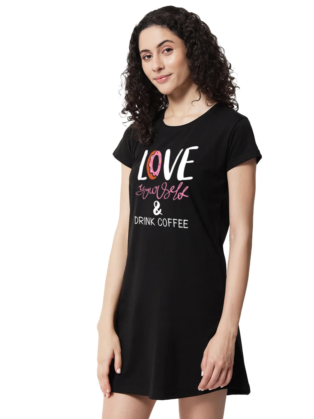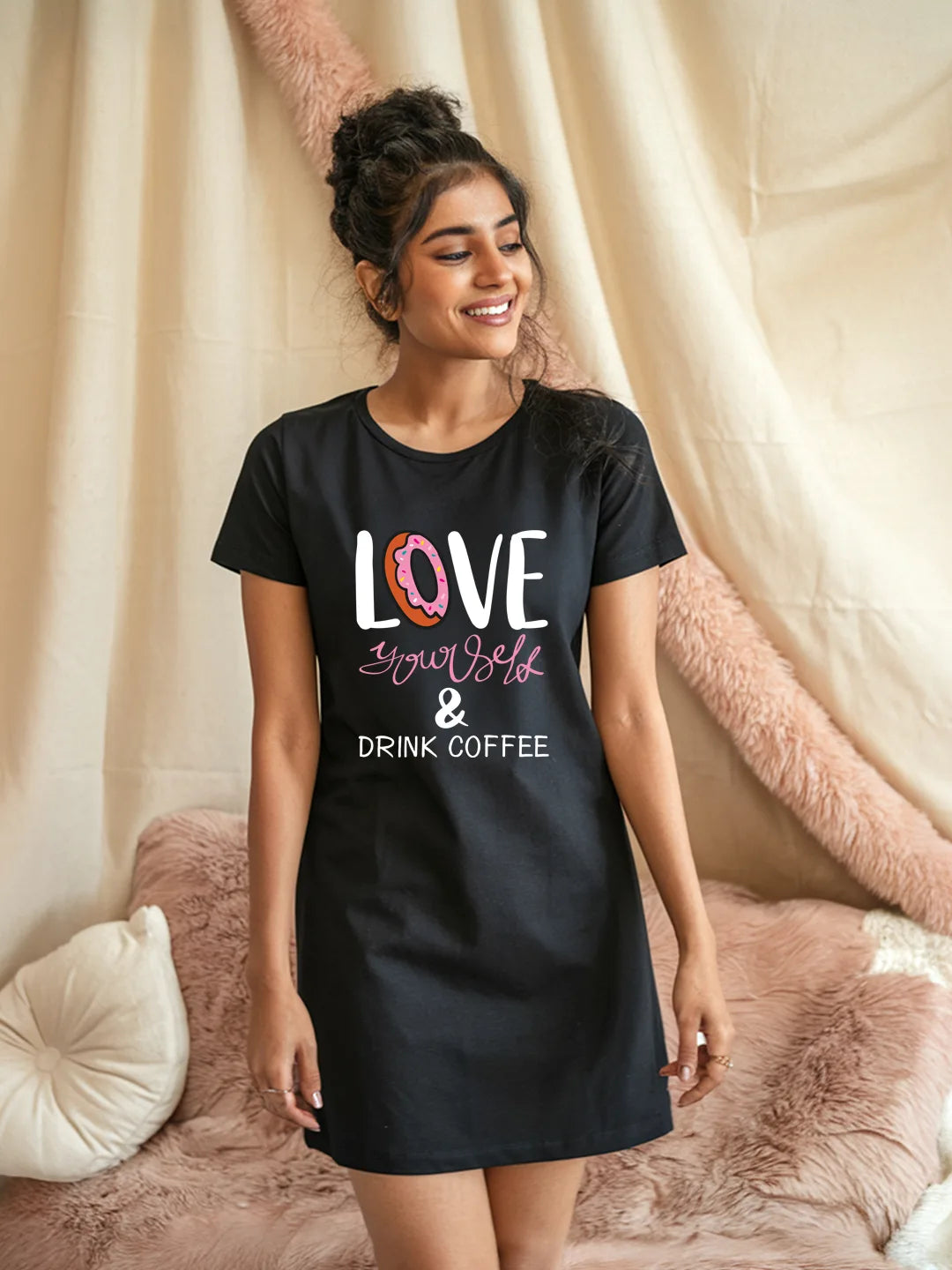 Combine two of your favorite things with our 'Love Yourself and Drink Coffee' print. This fun and quirky design features the message 'Love Yourself and Drink Coffee' in bold letters, set against a playful background. Made with high-quality materials and available in a range of sizes, this garment is perfect for anyone who wants to add a touch of humor to their wardrobe. Whether you wear it to a coffee shop or out for a casual day with friends, our 'Love Yourself and Drink Coffee' print is sure to make a statement and let everyone know just how much you love both yourself and your favorite caffeinated beverage.