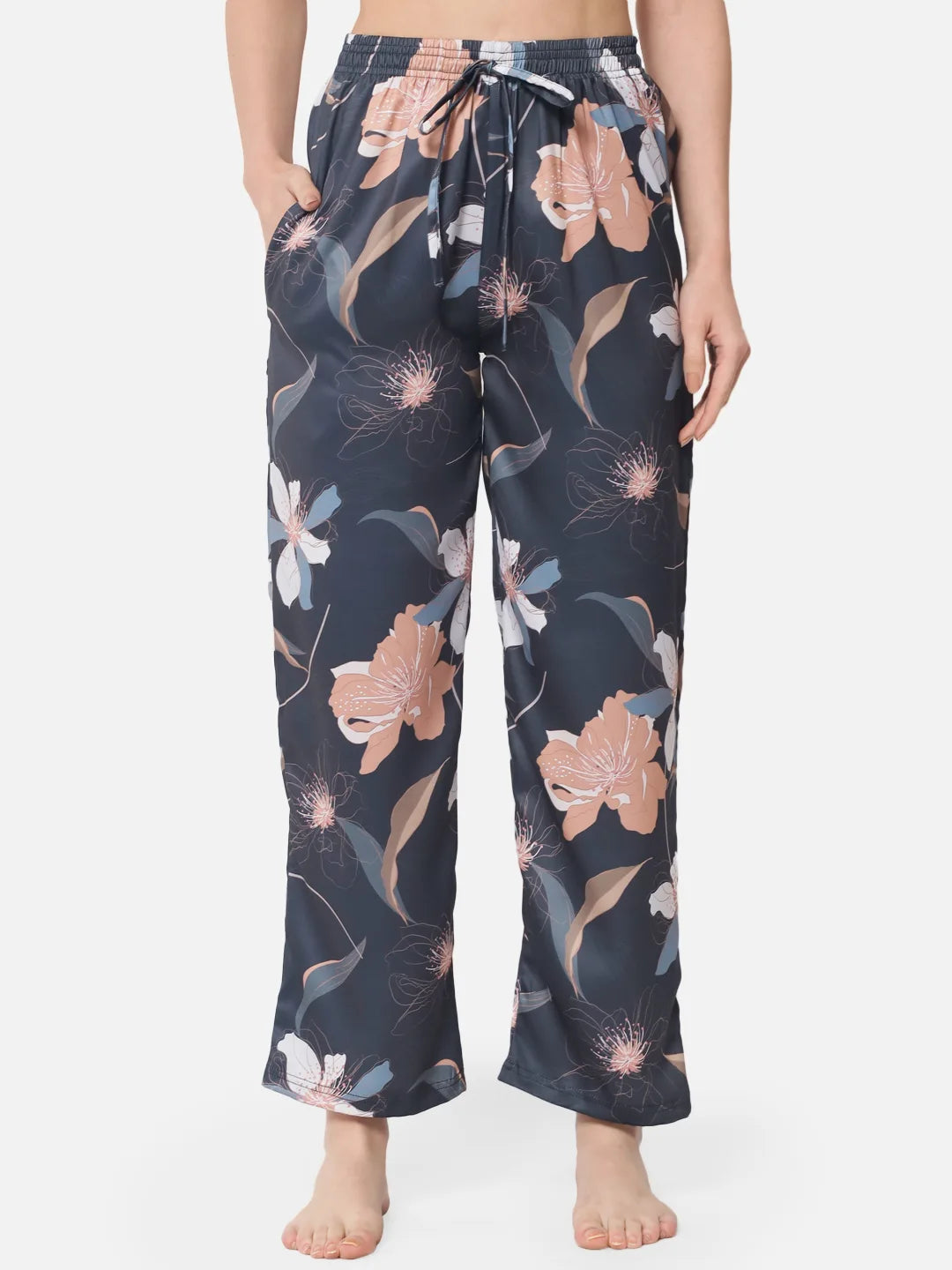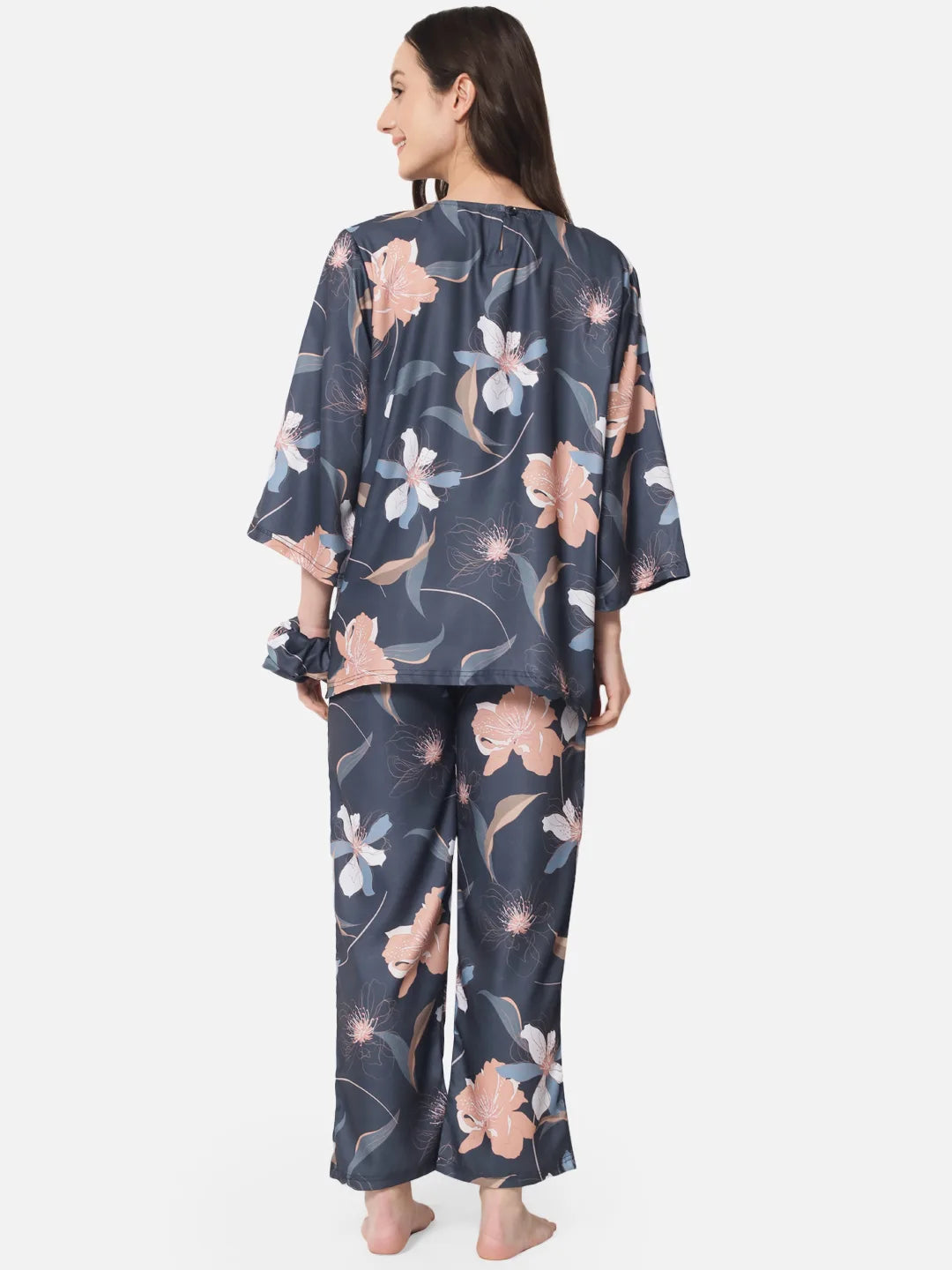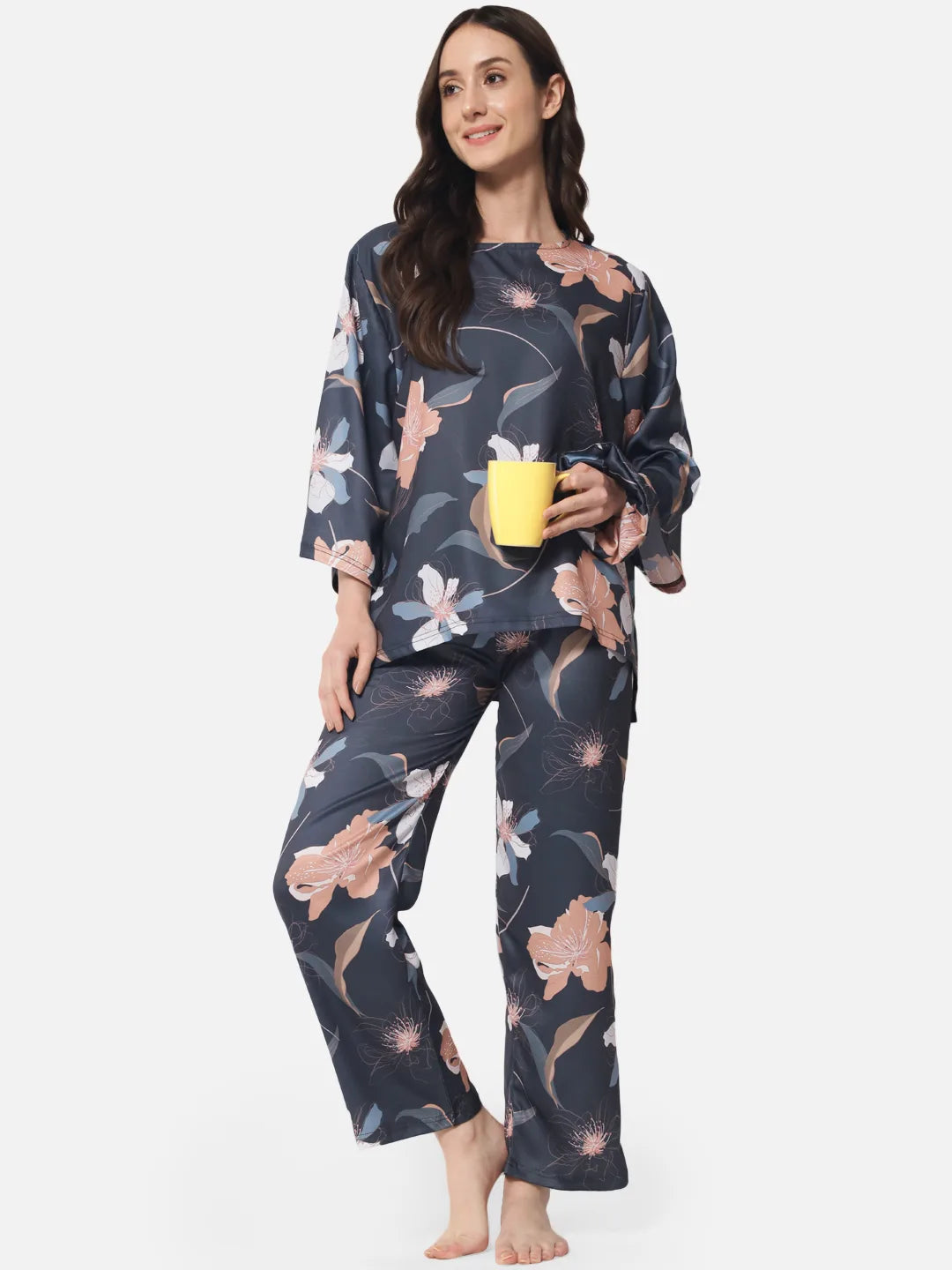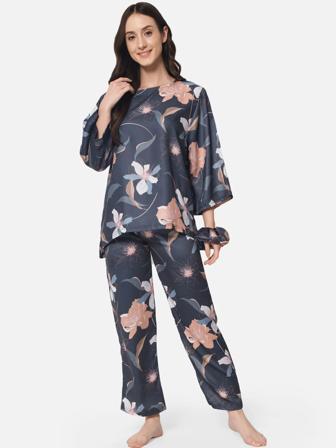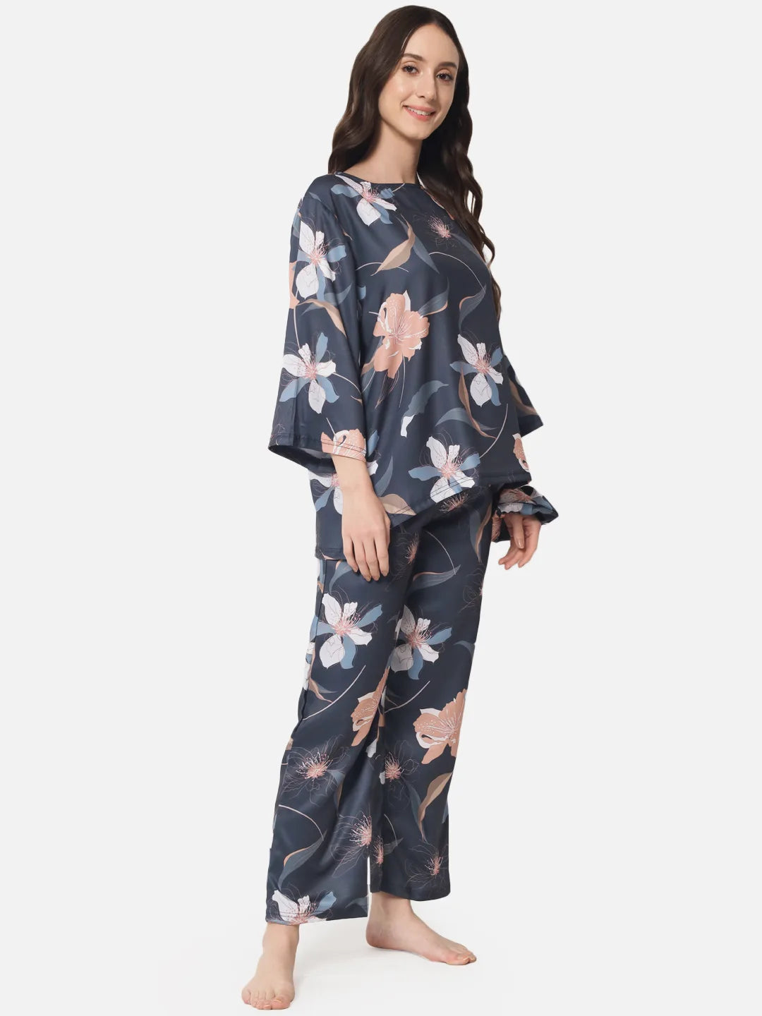 This nightwear set for women is the perfect combination of comfort and style. The set includes a loose-fitting top and a pair of pyjama pants, both crafted from a soft and silky fabric that has a slight shine to it. The slate gray base of the fabric is adorned with a beautiful copper and blue floral pattern, adding a touch of elegance to the set. The top features a relaxed fit and comfortable sleeves, while the pants have a snug fit with a flexible waistband, ensuring a perfect fit and a comfortable feel.