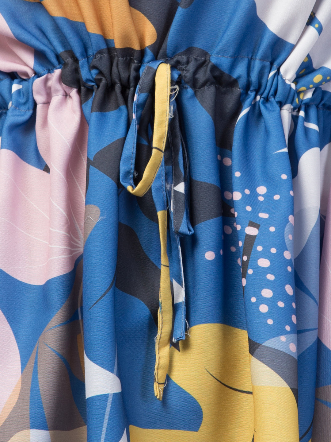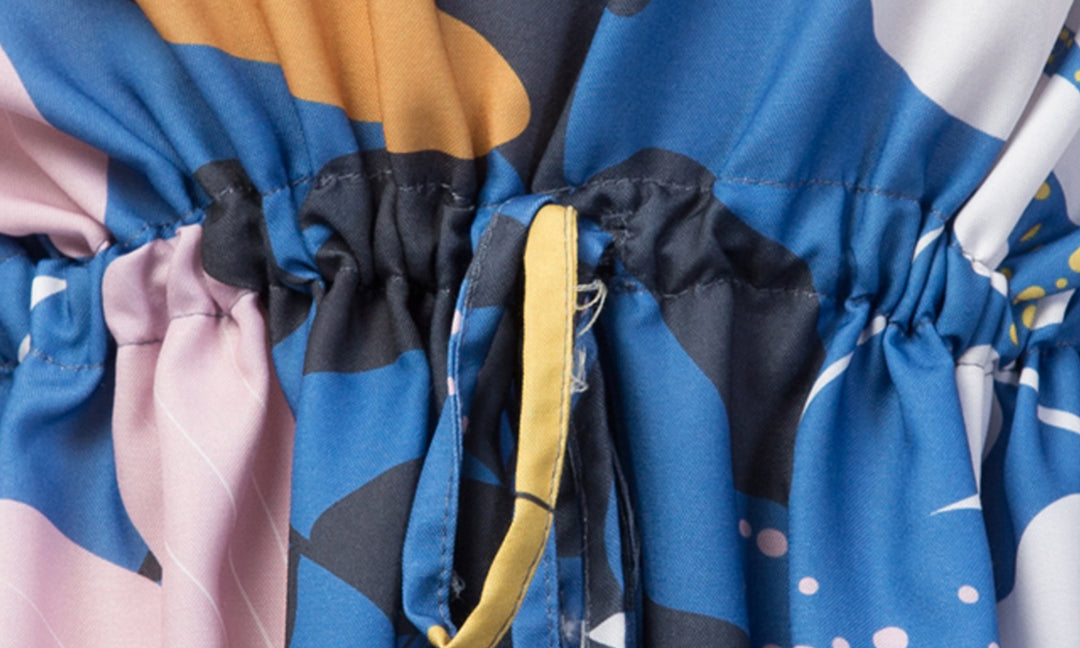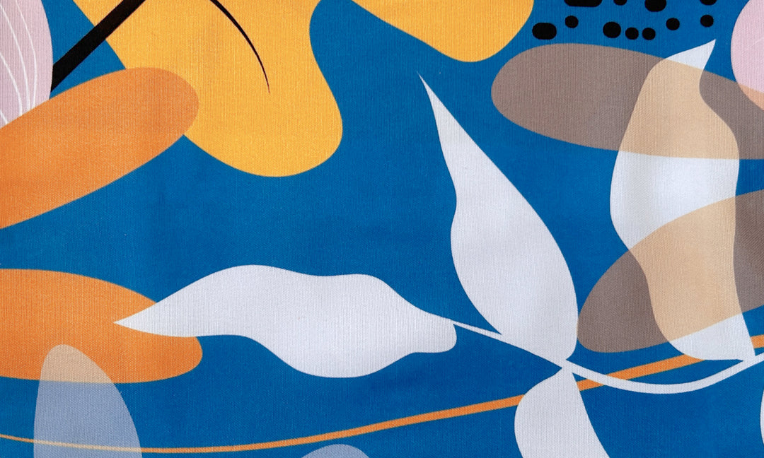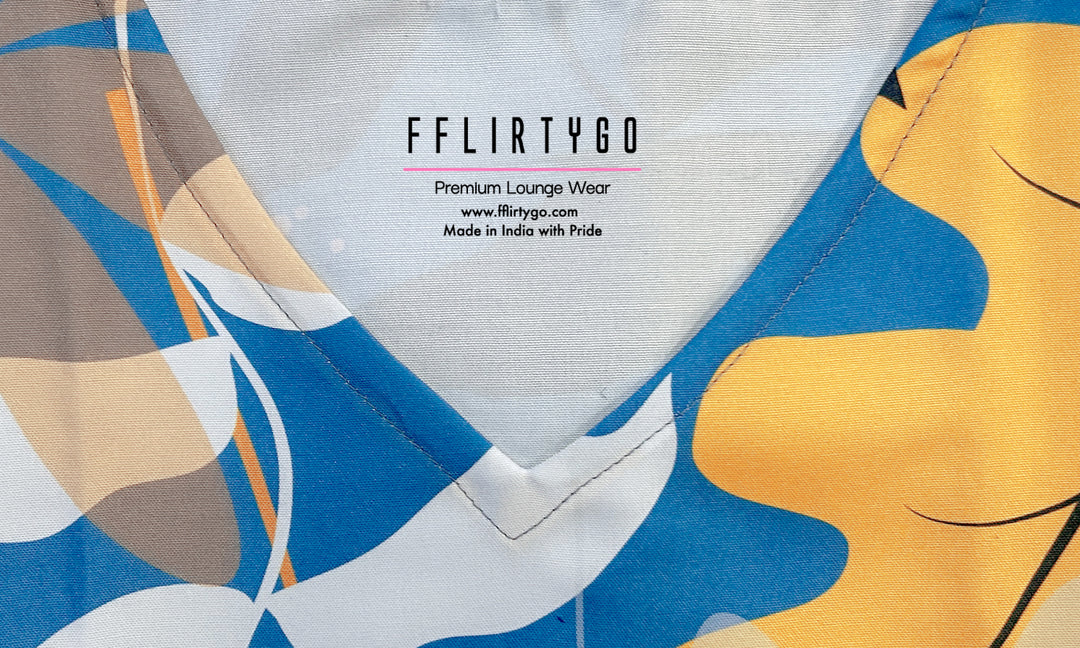 The Modern Garden set presents a captivating design, featuring an array of yellow, orange, pink, black, and brown elements that come together to form a delightful abstract floral and leaf pattern on a beautiful blue base. This innovative fusion of colors and shapes creates a refreshing, energetic atmosphere, perfect for those who appreciate a touch of creative flair in their relaxation attire.
