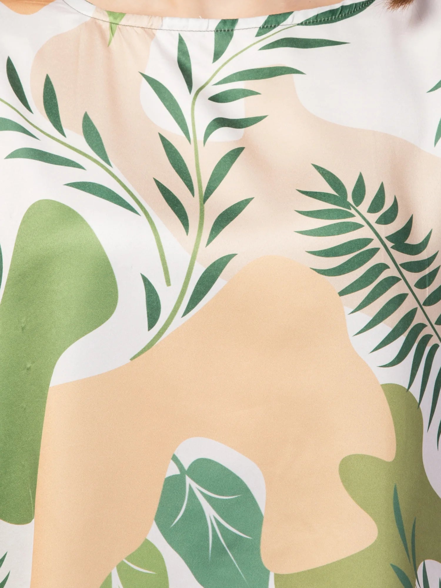 Experience the light and refreshing design of our Summer Breeze FflirtyGo Nightwear Set. The set features abstract shapes of green and orange on a white base, with an assortment of green leaves scattered across the print, creating a breezy and summery look that's perfect for any occasion.