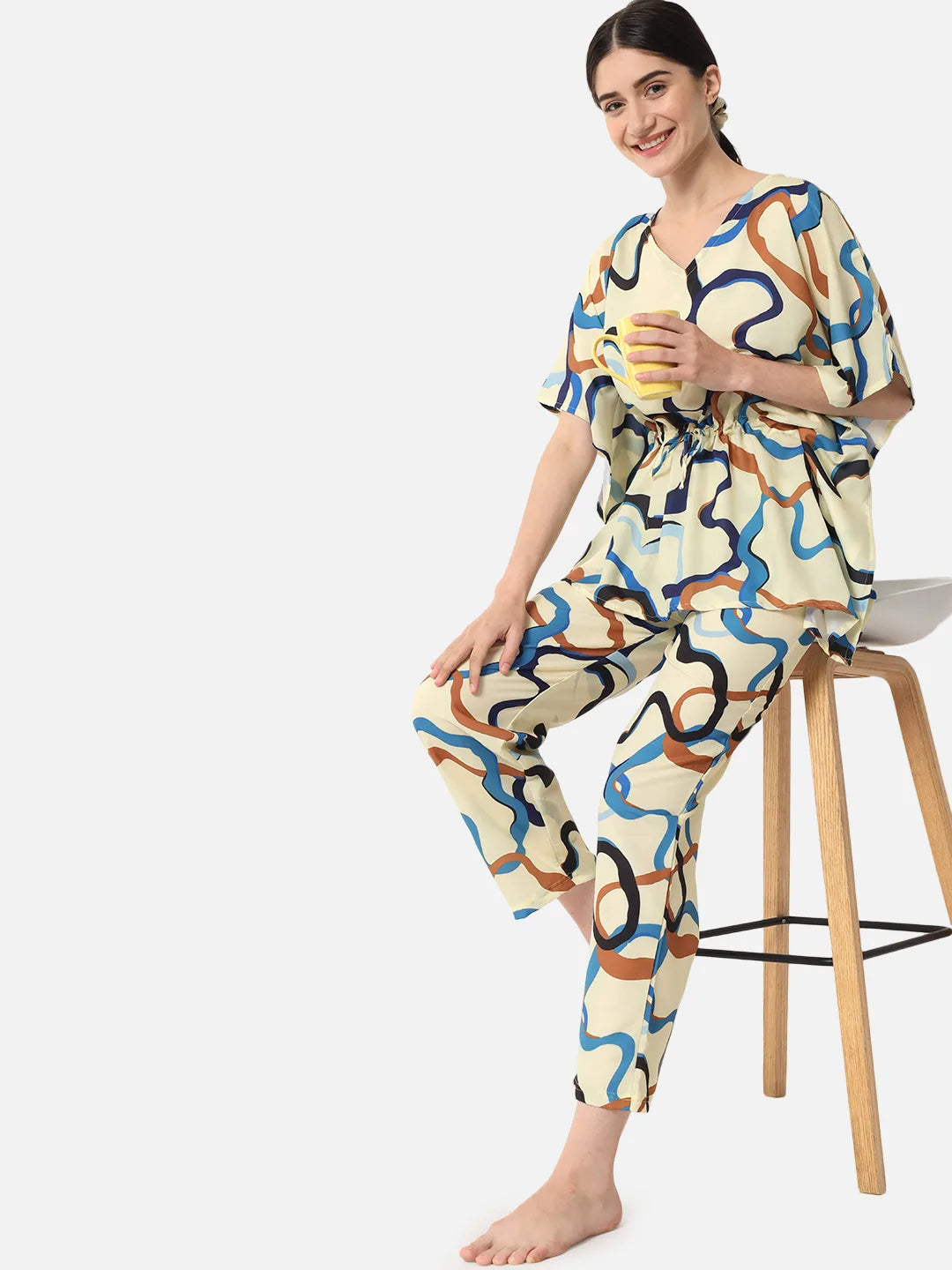 Our line art kaftaan set is the perfect addition to your sleepwear collection. This comfortable set includes a kaftaan top and pants, both made from soft and lightweight fabric. The top boasts a flowy silhouette and short sleeves, while the pants are designed with a relaxed fit and an elastic waistband for ultimate comfort. The light yellow color of the fabric is accented by neutral shade lines all over the surface, creating a unique and eye-catching look. As a special bonus, this set comes with a free scrunchie to keep your hair out of your face while you sleep. Whether you're lounging at home or spending a relaxing evening in, this kaftaan set is sure to become a staple in your wardrobe. So why wait? Upgrade your sleepwear game with our light yellow line art kaftaan set today!