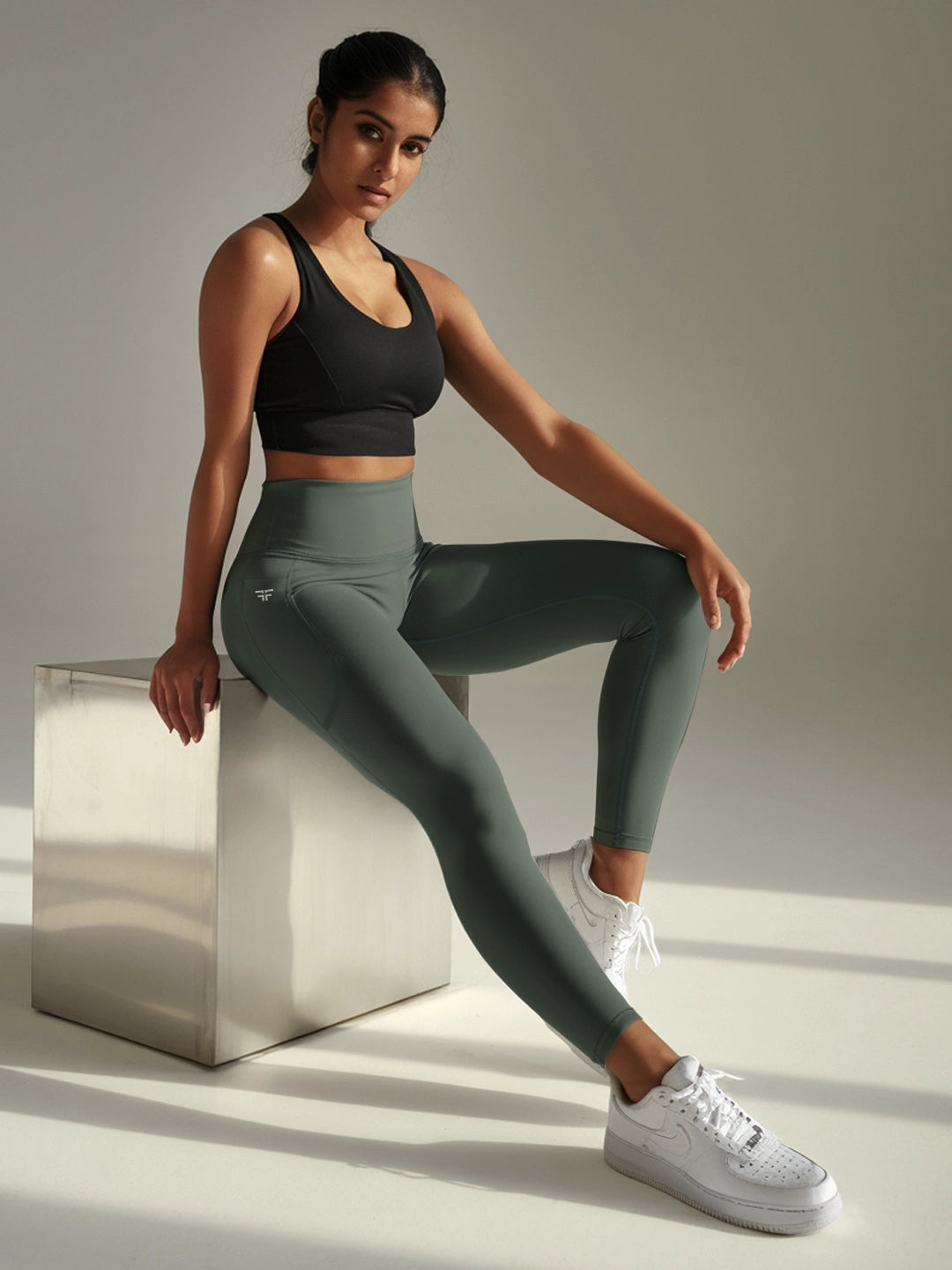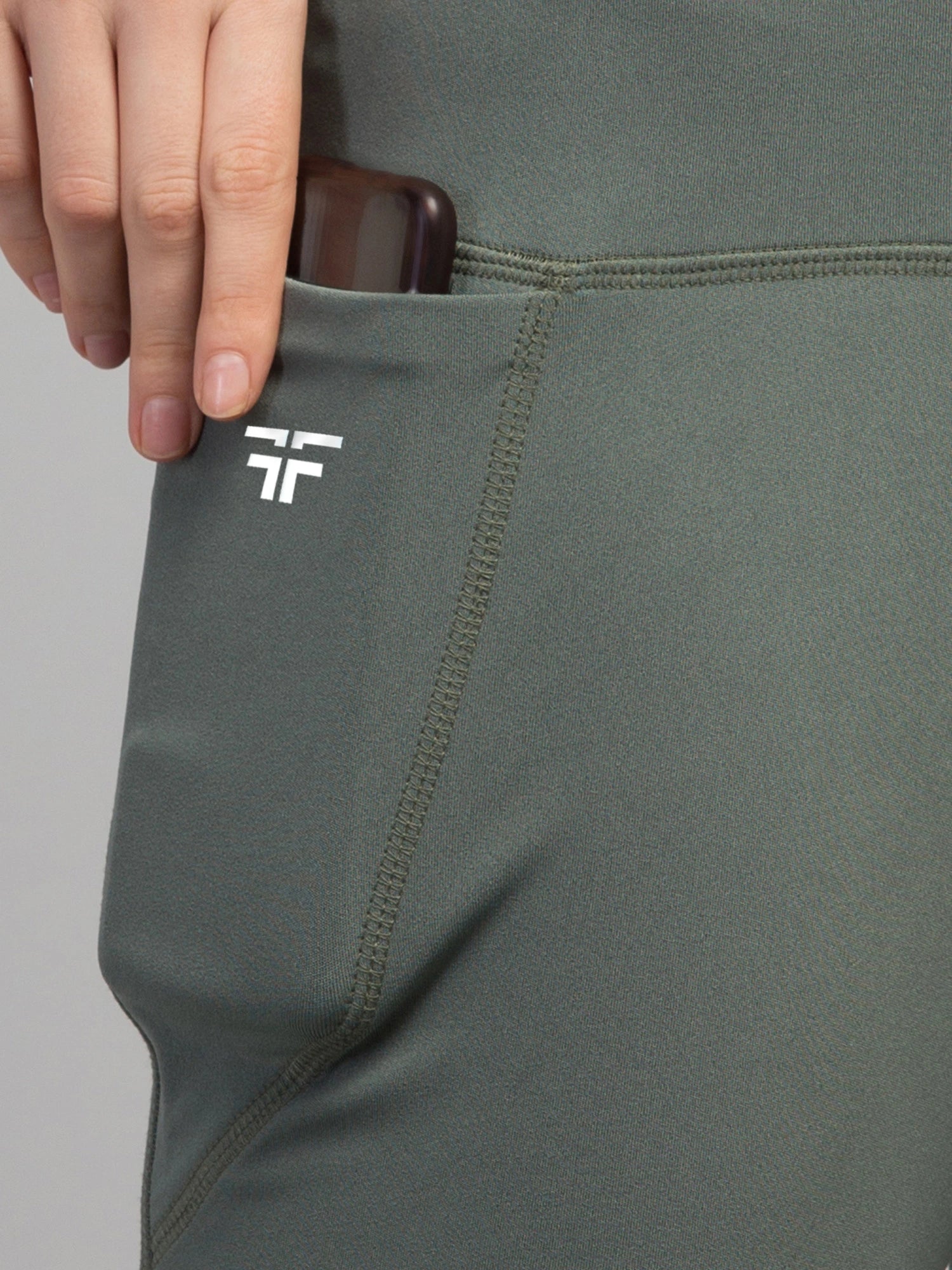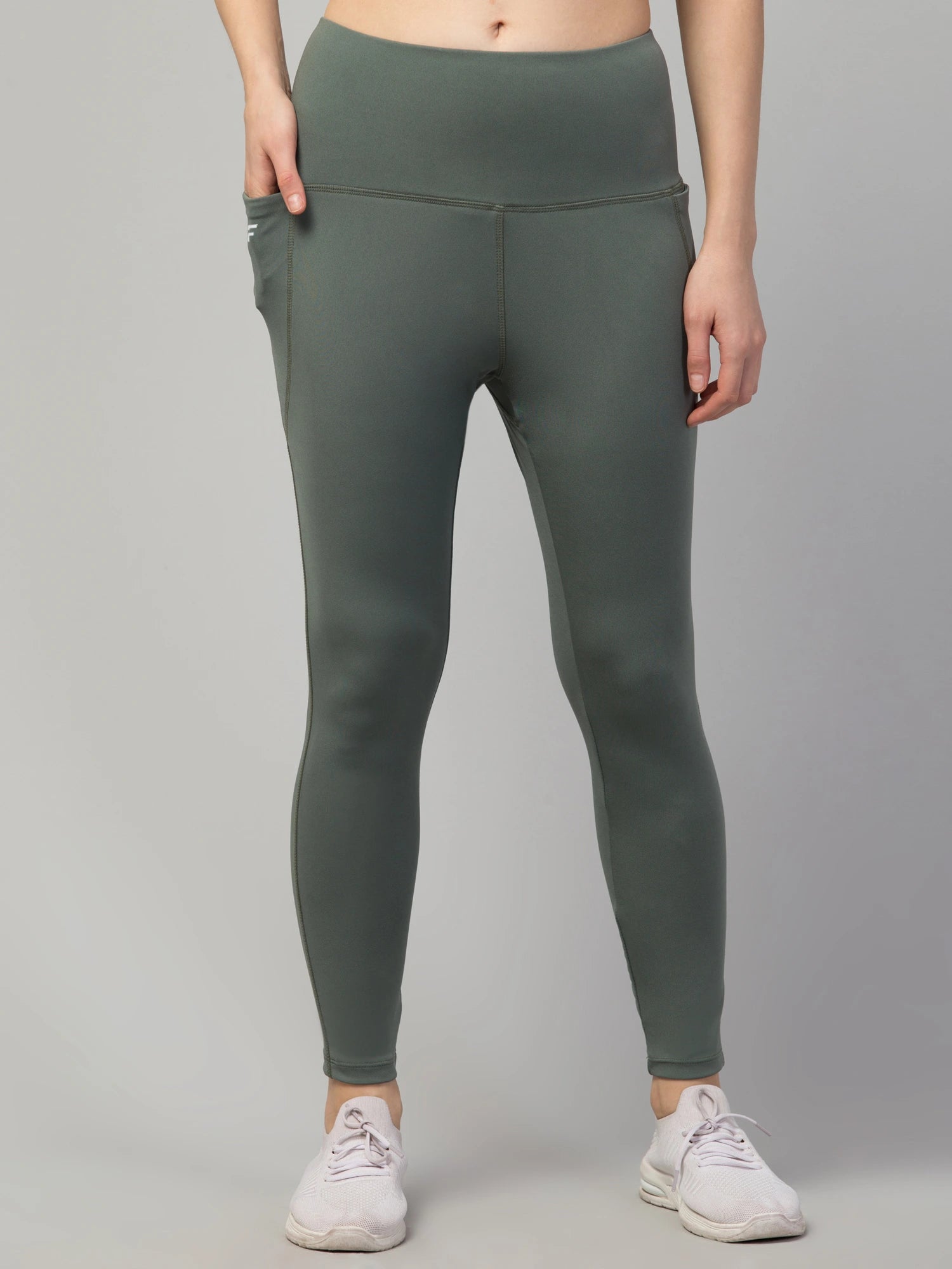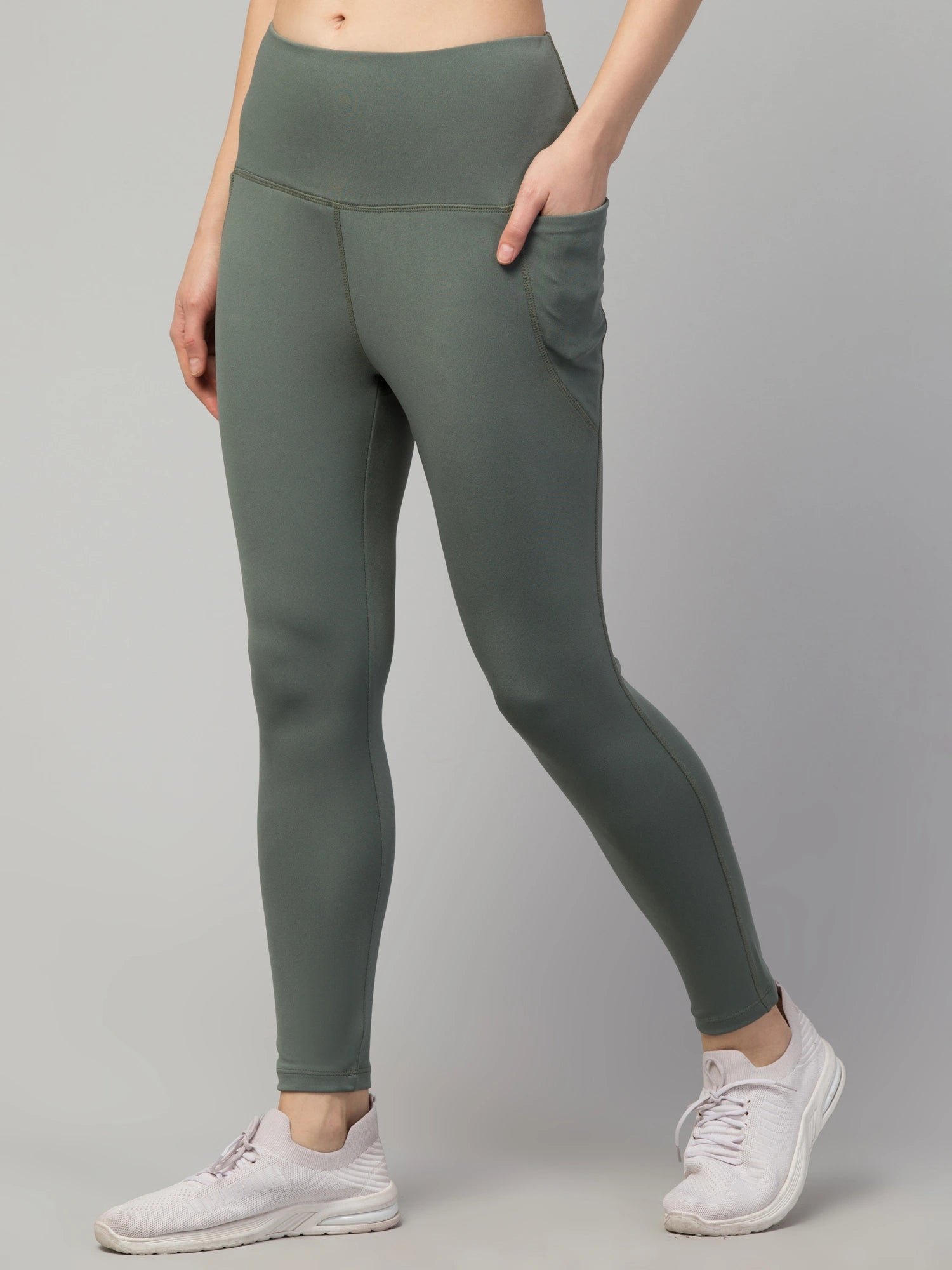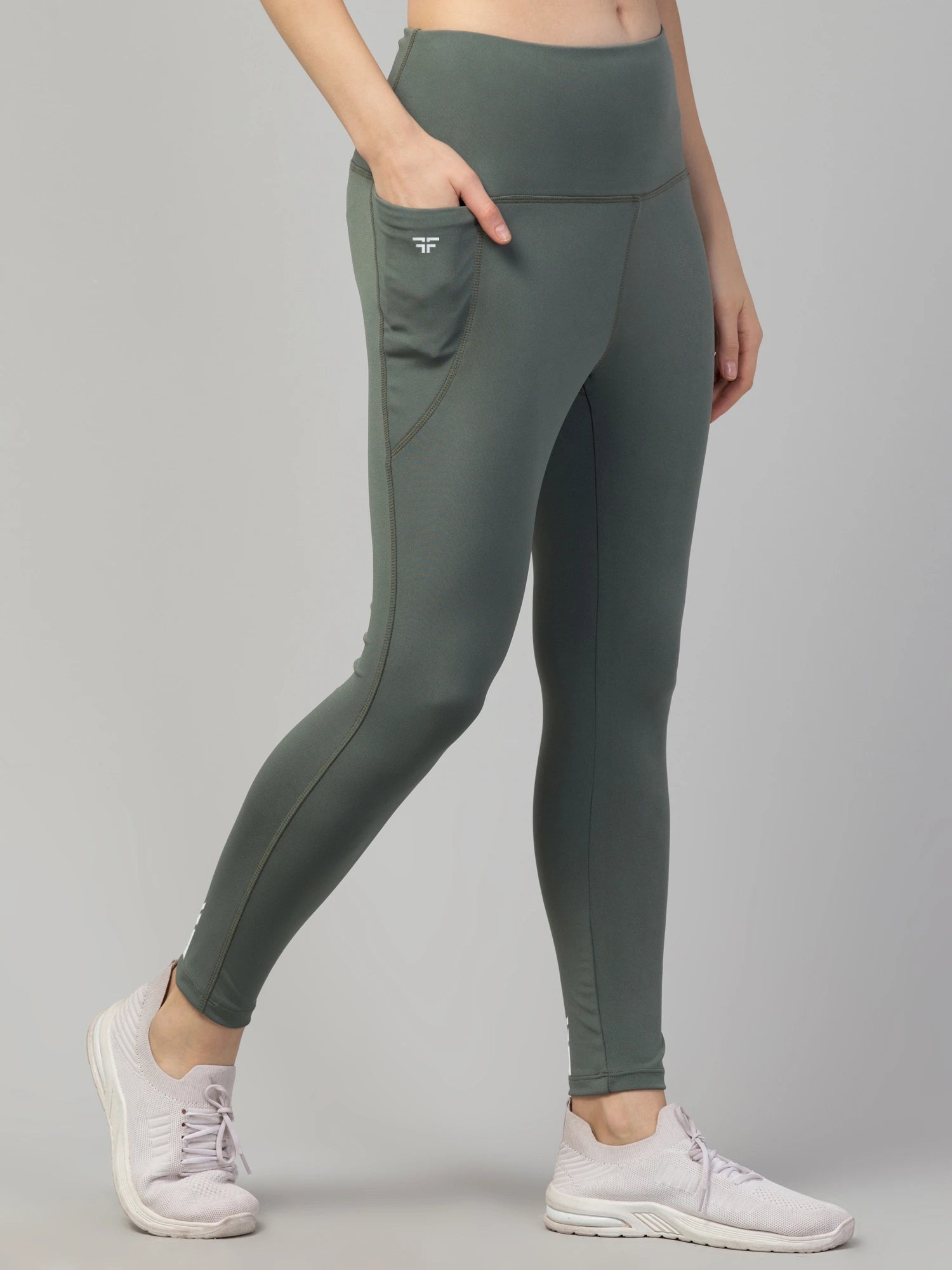 (Keywords: Mystic Sage Leggings, FflirtyGo, greenish-gray leggings, 4-way stretch Lycra, fitness leggings, leggings with pockets)