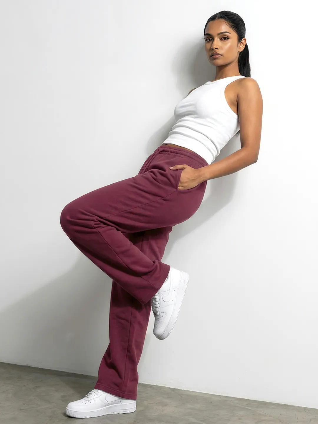 These Marron Mélange Straight-Fit Joggers are designed for women who want a clean, modern look without sacrificing comfort. Crafted from breathable 240 GSM Cotton Terry, they feel soft, structured, and perfect for all-day wear — whether you're running errands, working from home, or heading out for a casual day.