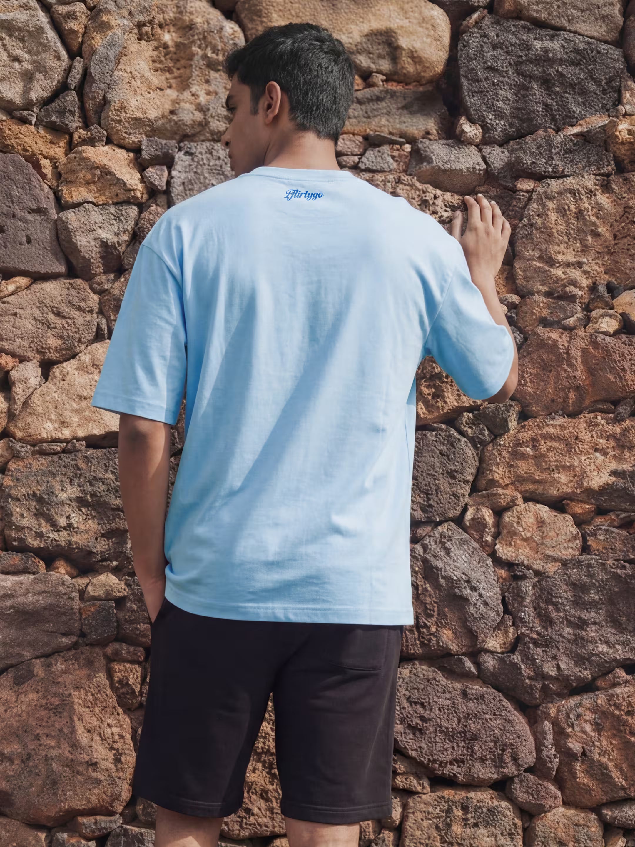 Sky blue base. Navy print. The kind of tee that looks good doing nothing and feels better doing everything.