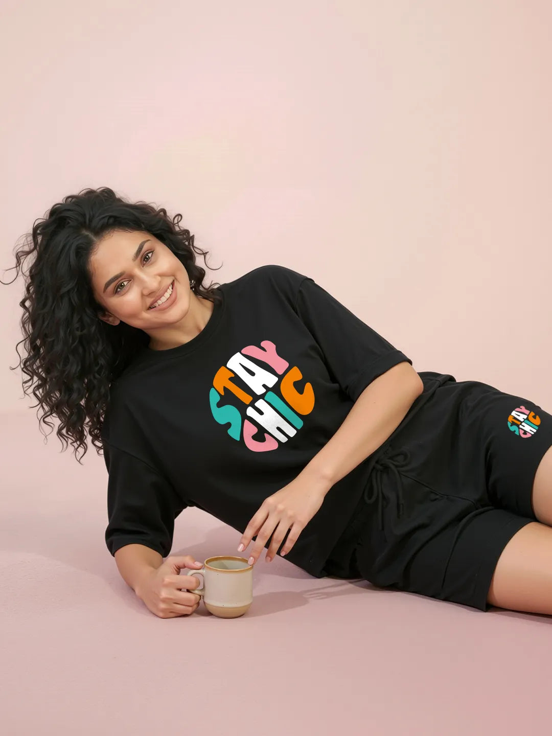 Designed for effortless nighttime comfort, this two-piece nightwear set features a relaxed-fit black T-shirt with a vibrant, colorful “STAY CHIC” text design on the front, paired with easy, breathable shorts for a laid-back silhouette that feels as good as it looks. The classic black base combined with playful color accents creates a stylish, modern look—perfect for relaxed nights with a touch of flair.
