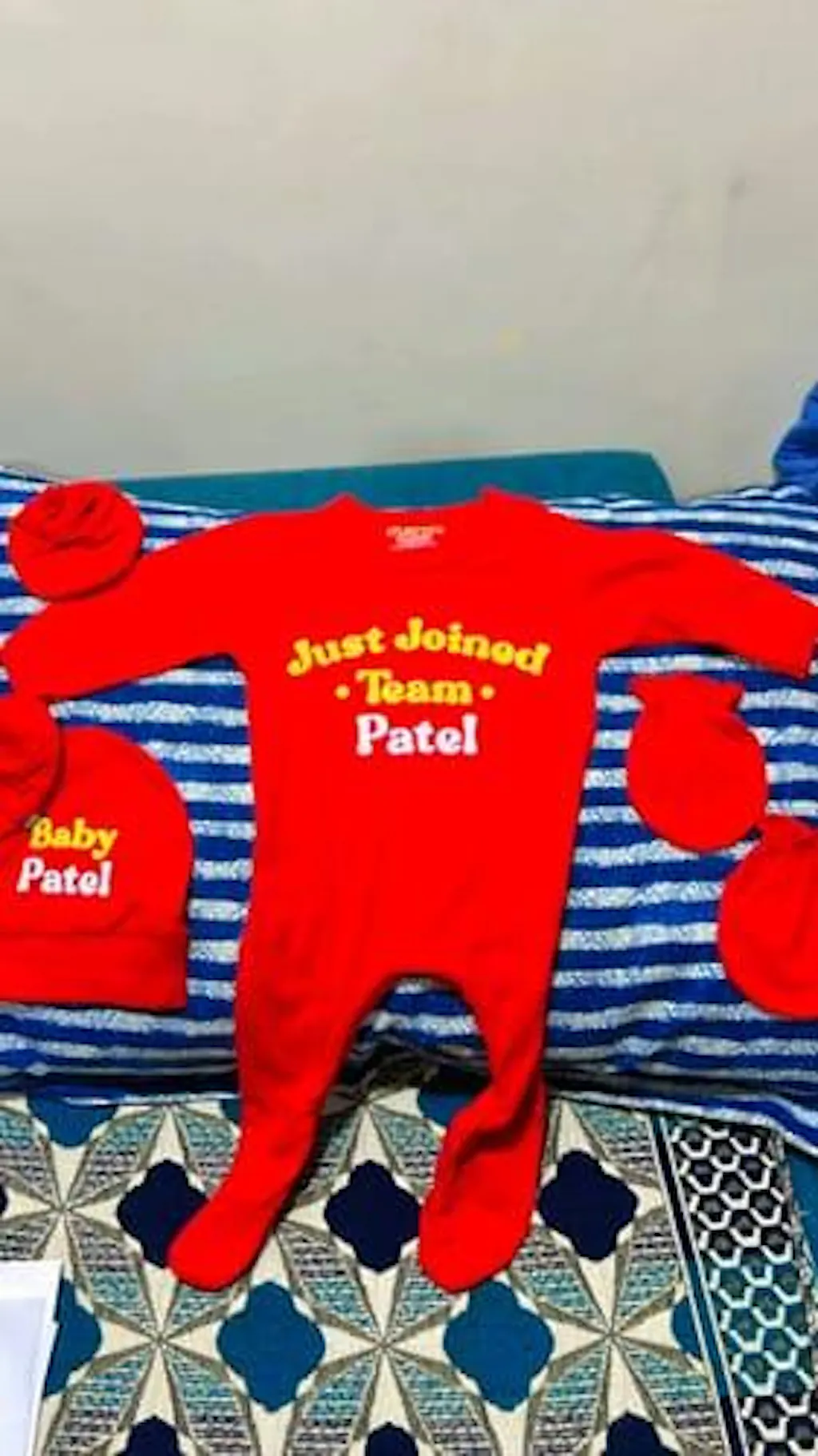 This enchanting set comes with a comfortable baby jumpsuit, a warm cap, a pair of soft mittens, and snuggly booties. A charming yellow print adorns the jumpsuit with "Just Joined Team [Surname]", while "Baby [Surname]" embellishes the cap, adding a dash of personalization to this unique gift.
