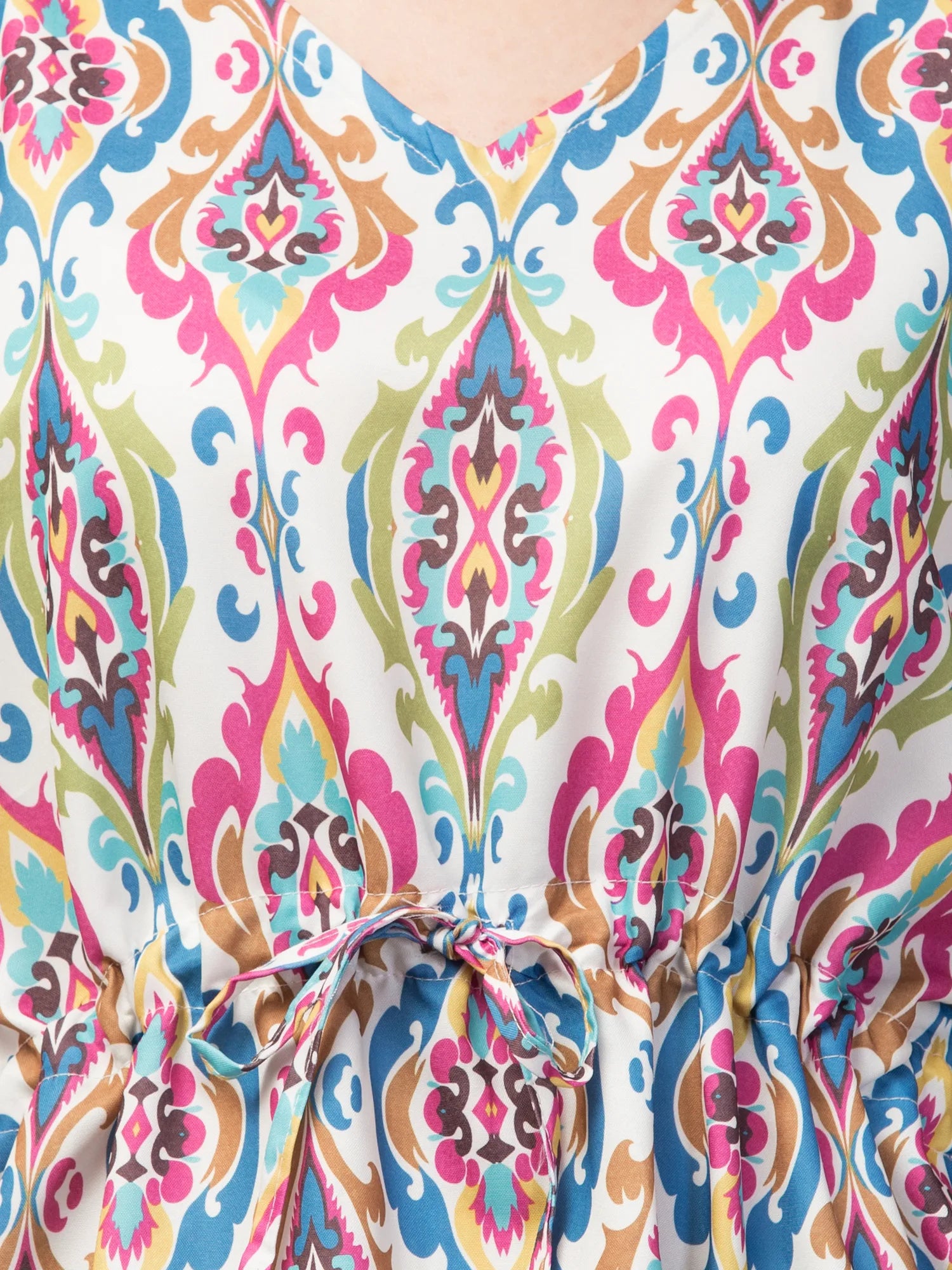 Introducing our Traditional Treasures FflirtyGo Kaftan Set, the perfect addition to your loungewear collection. Featuring a stunning white base, this kaftan set is adorned with intricate traditional motifs in a range of vibrant colors, adding a pop of color and personality to your loungewear.